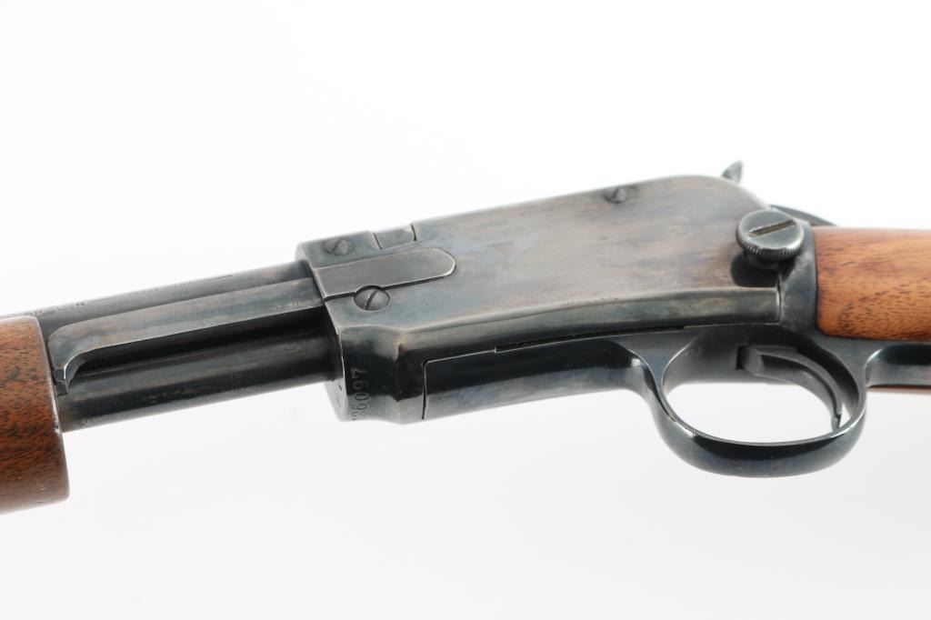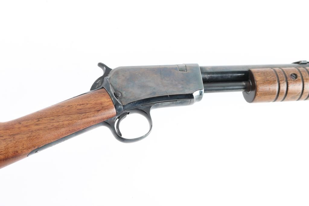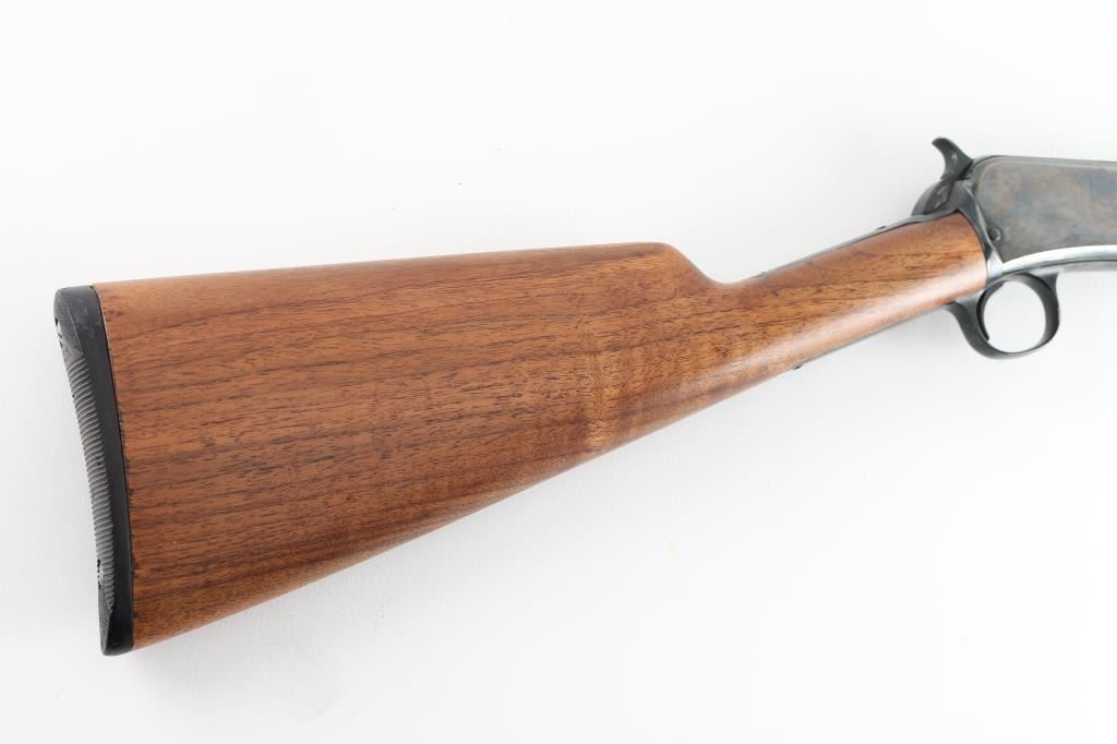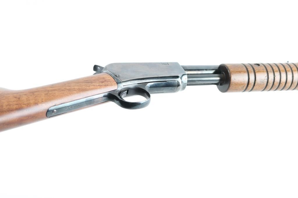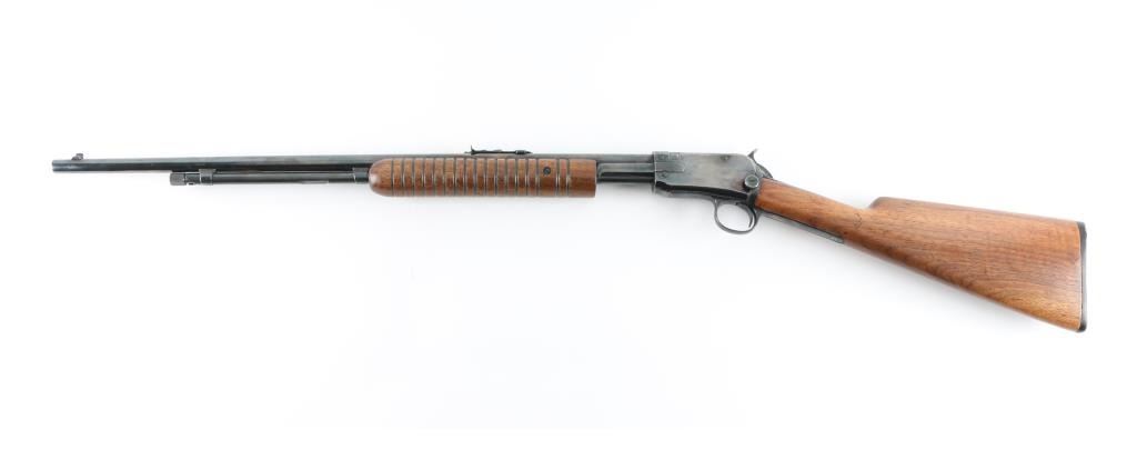 Pump action rimfire rifle manufactured circa 1940. Features blued finish, grooved wood pump handle, wood butt with straight grip area, factory hard rubber buttplate, 23" round barrel, blade front sight with bead top, sporting rear sight, magazine tube under barrel, external hammer, take down screw in receiver. Rear sight installed backwards. Bore is generally good condition, appears to have light rust near muzzle, including a dark ring several inches back. Retains 90% high polish re-blue with edge losses, heavy buffing has altered some sharp edges and partially eroded some barrel markings. Small areas of rust on barrel and on magazine tube under pump handle. Wood is very good condition overall, lightly sanded butt shows losses at tang. Numbers match on receiver cover & lower tang. Condition is NRA Good++ (refinished) *** C&R Firearm ***