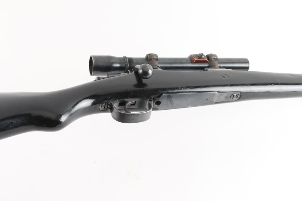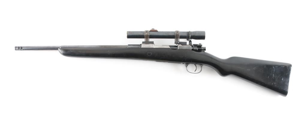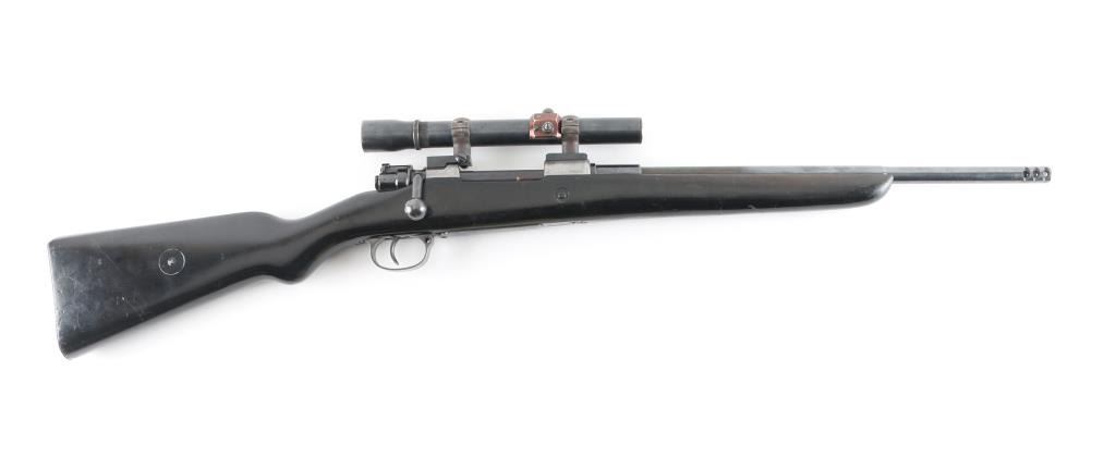 Unknown caliber sporterized military bolt action rifle. Made in Austria for the Chilean government. Original stepped barrel numbered to receiver, muzzle has been cut to form a muzzle brake, chambering unknown, bore size probably 7mm, must be checked by a gunsmith. Features 18.5" barrel with integral muzzle brake, sights removed, black painted military stock with shortened forend, steel buttplate, bent bolt handle, original style three position safety on shroud, drilled and tapped on top of receiver for two piece Redfield bases & rings. Mismatched bolt, numbered "3668". Bore is very good. Retains 40% finish, receiver mostly bare, bare metal where rear sight base was removed, handling and edge wear throughout. Stock is fair to good, solid, painted black. Mounts a good condition unmarked vintage low power scope, with clear view, fine crosshair. Condition is NRA Good (gunsmith inspection req'd) *** C&R Firearm ***