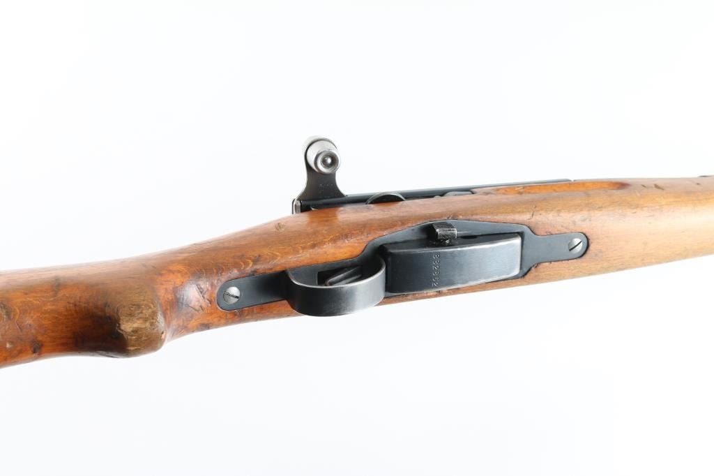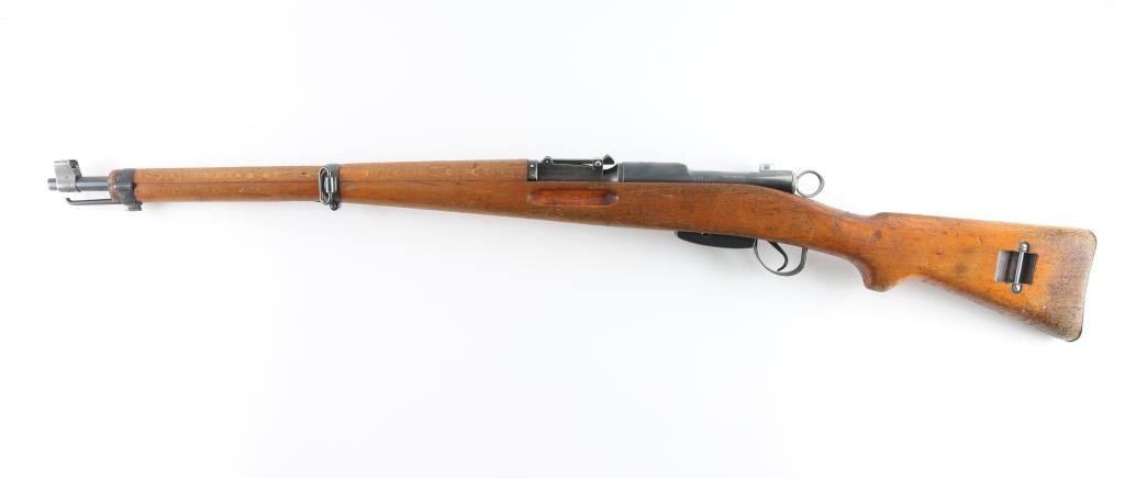 7.5mm SN: 882862. Swiss military straight pull bolt action rifle features blued finish, wood semi pistol grip stock, 25" barrel, bayonet lug, stacking hook, blade front sight inside protective ears, tangent rear sight, sling swivels, detachable magazine, manual safety, "beer barrel" bolt knob. Bore is very good condition. Imported by Samco, Miami, FL. (Underside of barrel. Retains 80% coverage of blued finish, showing edge losses & handling marks. Bolt assembly is mostly bright polished, some blued pieces, overall in very good condition. Stock is good condition, with many dents and scratches, discoloration near buttplate, finish losses in many areas (especially at butt). Bolt , receiver, barrel, and magazine have matching serial number. Swiss cross in shield on chamber. Bore is very good with strong rifling. Condition is NRA Good++ C&R Firearm