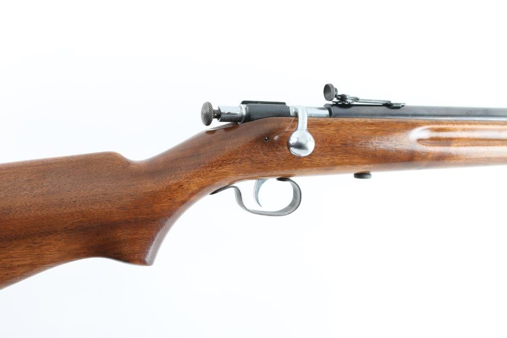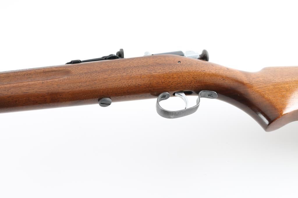 American made manual cocking single shot bolt action rifle chambered for .22 Short, Long & Long Rifle, manufactured pre-1968. Features a blued finish, 27" barrel, dovetailed blade front sight with bead top, adjustable rear aperture sight, smooth nickel plated trigger, metal trigger guard, knurled cocking piece, manual safety on the rear of the bolt, and smooth walnut pistol grip shoulder stock with finger grooved forend, high gloss finish & factory buttplate. Rifle exhibits approximately 85% of it's original blued finish showing scattered handling marks, thinning, a light amount of emerging surface rust on the barrel and what appears to be a drivers license number written in electric pencil on the left side of the barrel. Action is smooth, the bore is pristine, and the refinished wood stock is good+ with hairline cracks at the heel and screw used to fill hole in bottom near toe. Condition is NRA Good+ ***C&R Firearm***