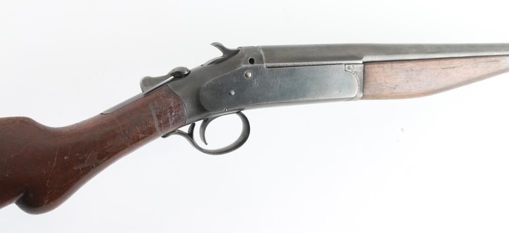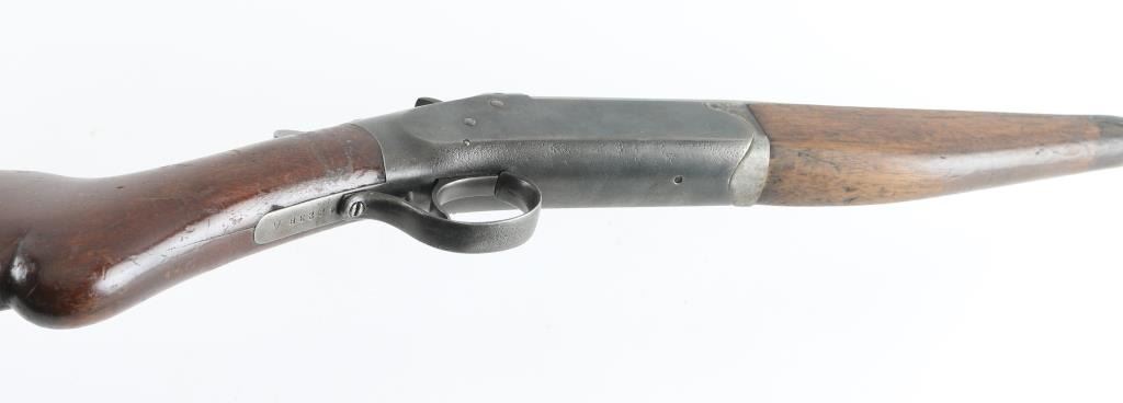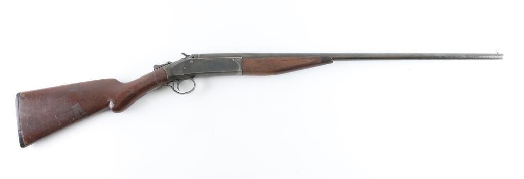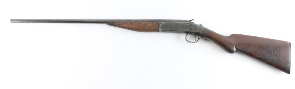 Single barrel break open shotgun manufactured circa 1920-1929. Features 26" barrel, brass bead front sight, blued finish, plain wood stock & forend, black hard rubber buttplate, top lever opening, exposed hammer. Bore is very good condition. Choke measures "IM" with drop-in gauge. Metal shows mottled browns and grays throughout, over pitting throughout. Markings are thin & eroded. Forend has large section poorly re-glued back in place. Stock is good overall with many scrapes. Top latch is loose, appears heavily hammered or otherwise misshapen. Condition is NRA Fair *** C&R Firearm ***
