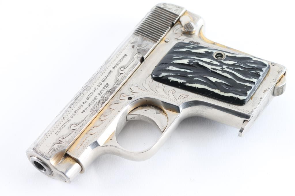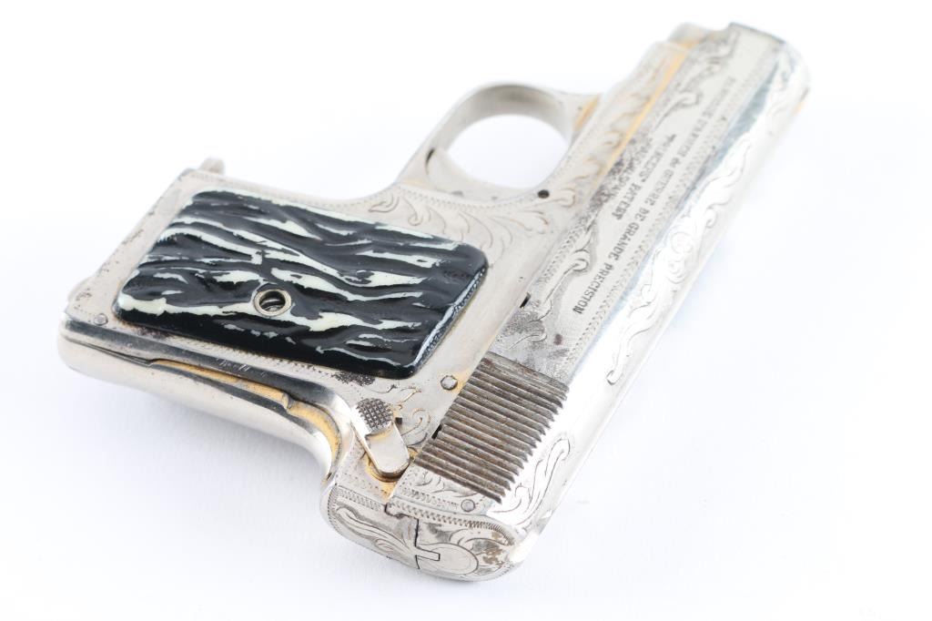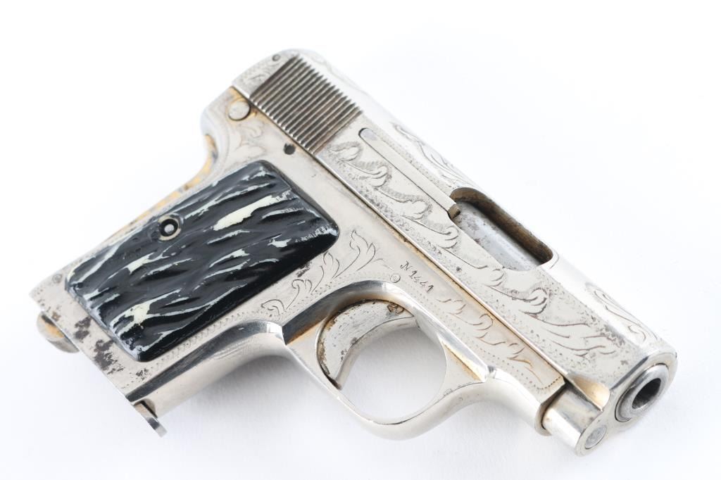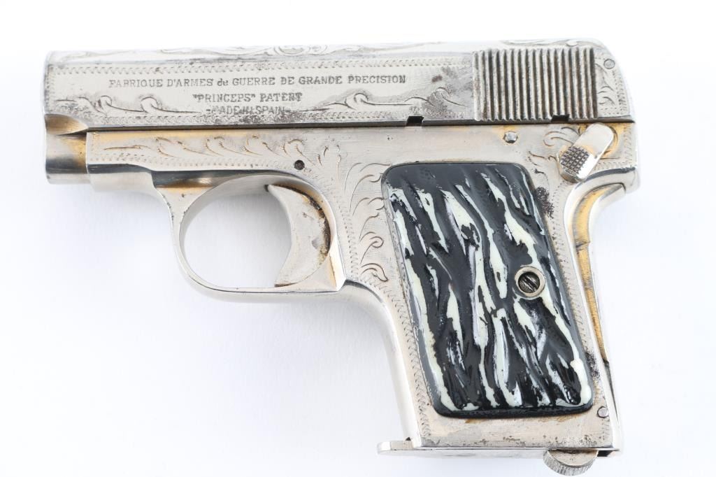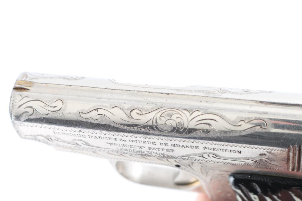 Spanish semiautomatic pistol, probably manufactured in the period between the World Wars. Features floral pattern engraving throughout, nickel finish, plastic stag grips, 2.5" barrel, fixed sights, grip safety, manual safety also assists in disassembly, heel magazine catch. Bore is good to very good condition, showing some frosting and light pitting. Retains very good silver color finish, with remnants of gold color wash retained in protected areas. Grips are very good condition, have lost much lighter color and show as mostly black or dark brown. Slide moves forward slowly, with slow release of firing pin, feels like gummy residue or dried oil. Includes one magazine. Condition is NRA Good++ *** C&R Firearm ***