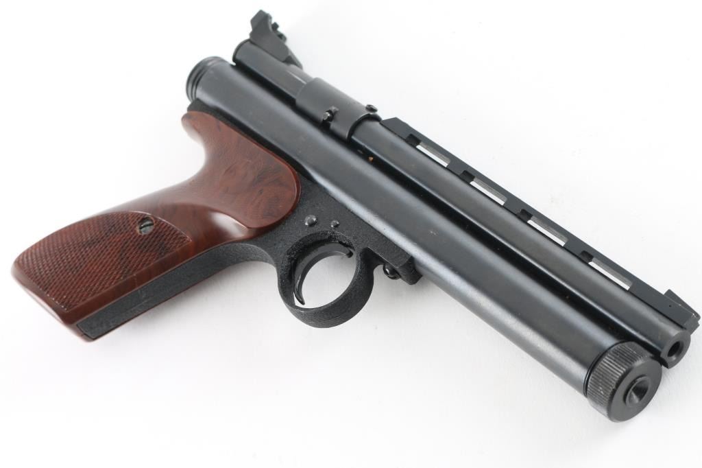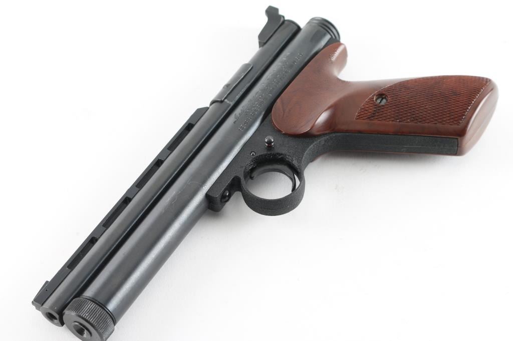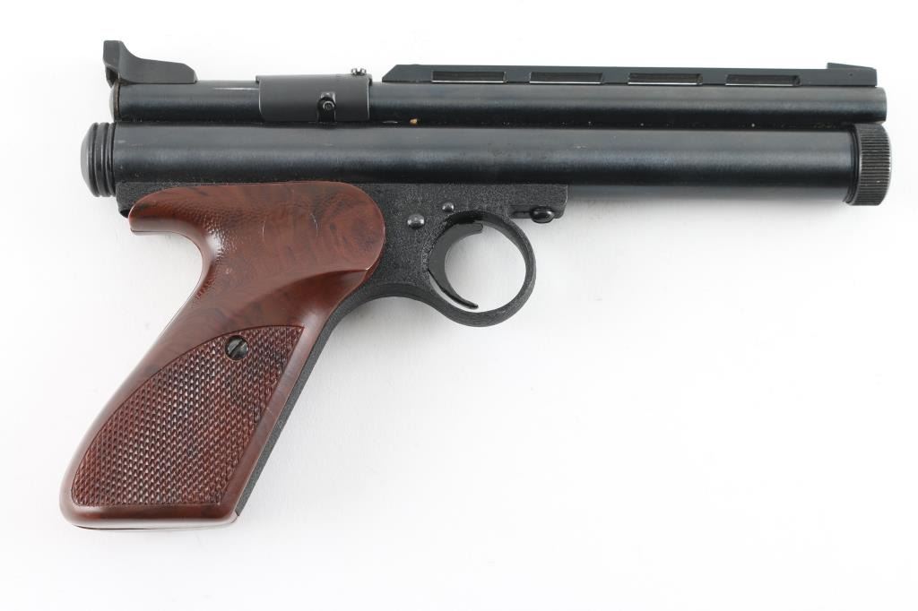 'Match Pistol' .22 Cal. Co2 , Blue finish, black textured frame, brown plastic, finger contoured grips. Excellent condition. Operates fine. "Antique" Firearm