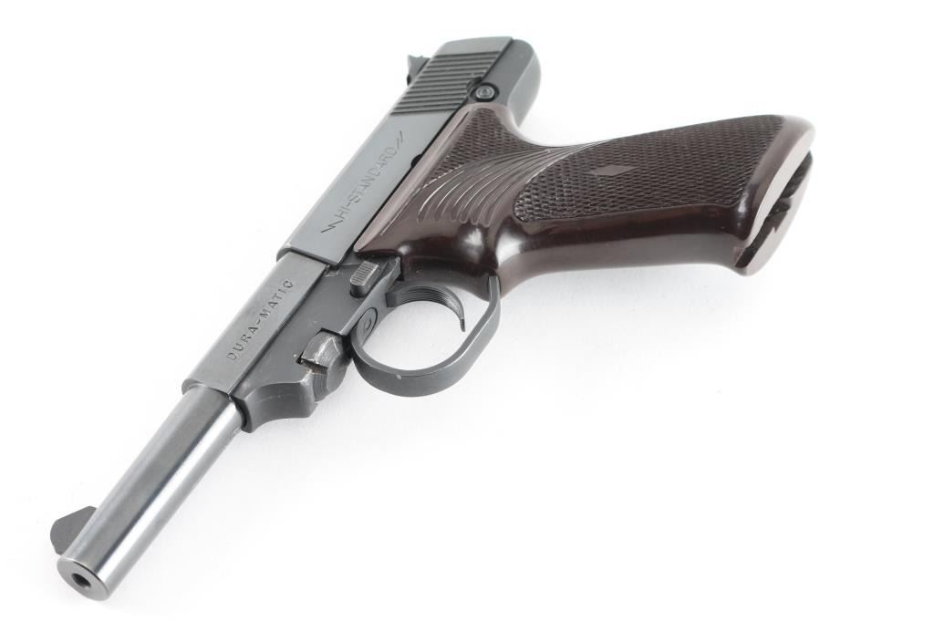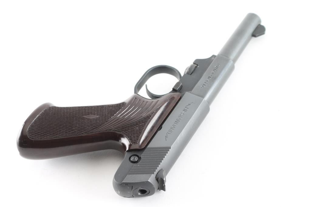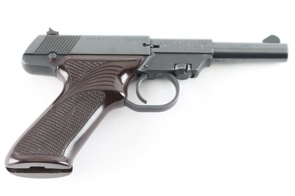 Semiautomatic rimfire pistol. Features a matte & polished blued finish, 41/2" barrel with thumb nut takedown, serrated patridge front sight, dovetailed rear sight with square notch, serrated trigger, cocked indicator, push button safety/slide catch on the frame, push button magazine release on the left side of the frame, steel frame and checkered one-piece faux wood wrap-around brown synthetic grip. Bore is very good condition. Retains full coverage of finish, very good with some minor scratches. Grips are very good. No Magazine included. Condition is NRA Good C&R Firearm.