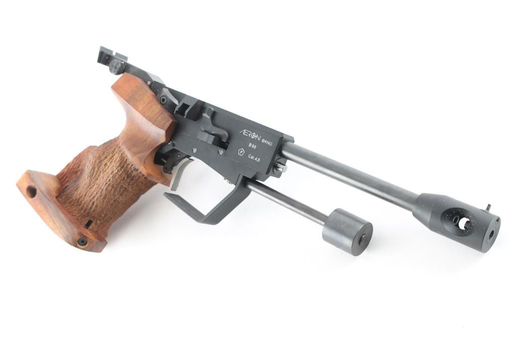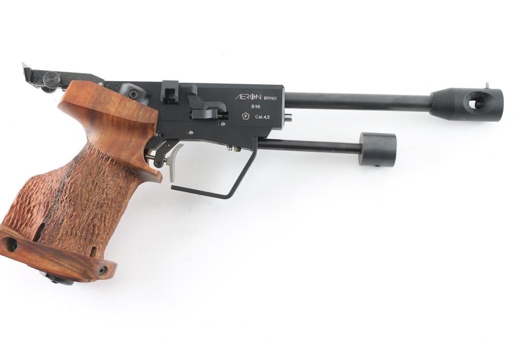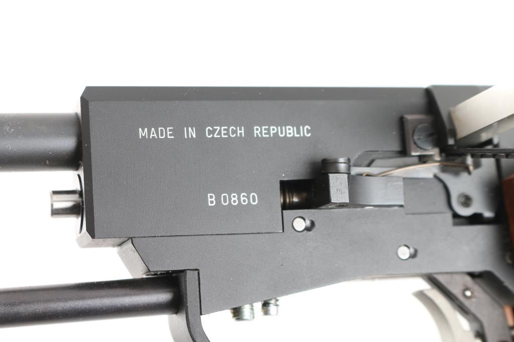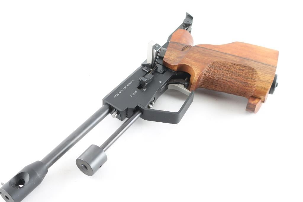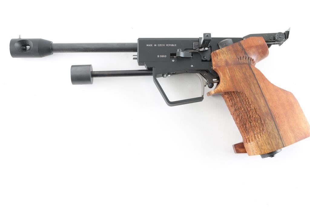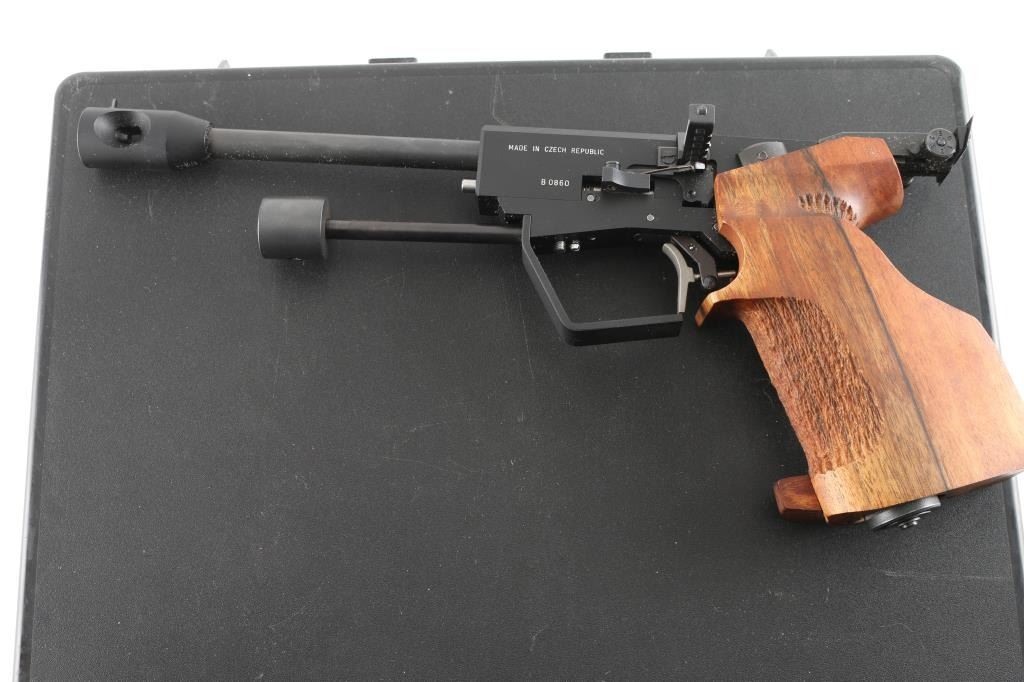Made in the Czech republic by Brno, , self-loading rapid fire C02 pistol, intended for sports/competition shooting complying with ISSF regulations, Adjustable rear sight, barrel weight, trigger, and pistol grip. Includes a 1 shot, and 5 shot magazines. Contoured wood grip for right handed shooting. Very good condition. Comes in hard case with manual, spare parts, C02 canister, tin of ammo. "Antique" Firearm