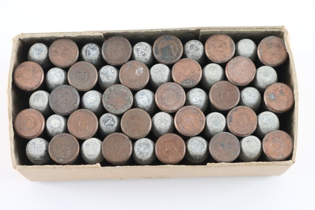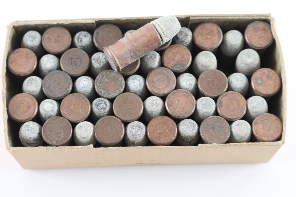 appears to be approx 50 rounds, in a plain cardboard box without lid or label, copper cases are headstamped "U" for Remington UMC. Flat nose lead bullets all show light gray oxidation. Some light corrosion on a few cases.