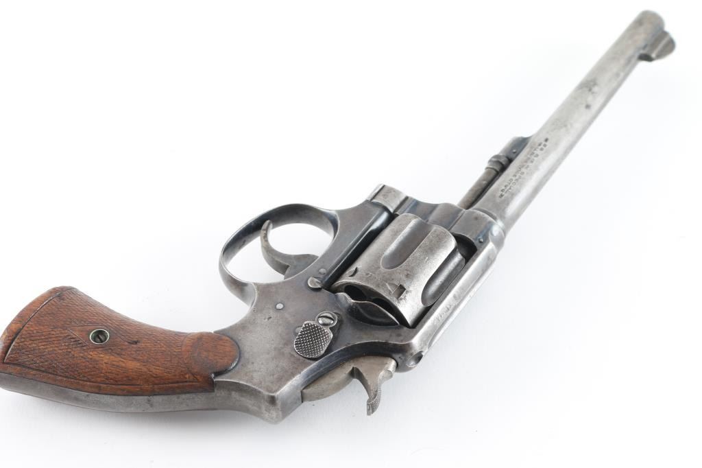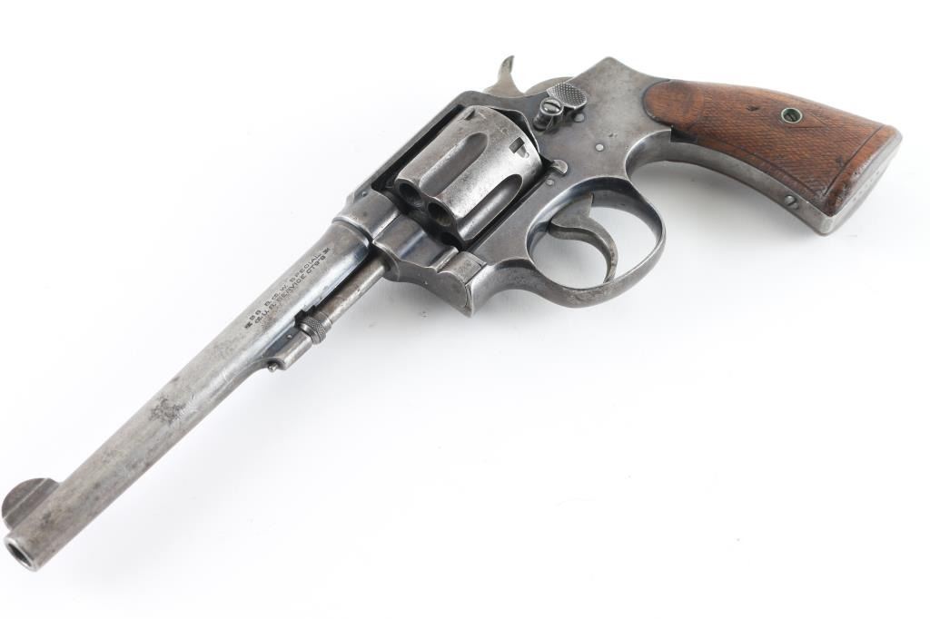 '.38 Military & Police Model of 1902 - 1st Change', manufactured circa 1903-1904. Features blue finish, checkered wood grips, pinned 6.5" tapered barrel, blade front sight, notch rear sight in top strap, 6 shot fluted cylinder, four screw square butt K frame. Bore and charge holes are very good condition, need cleaning. Blue finish is about 25% the rest is a mottled mix of patina gray/browns, faded, large areas appear bare metal, some small pits. Grips are sound with worn checkering, there is a small chip out of the upper left panel. Action is smooth and has tight lock-up. matching serial numbers. NRA Condition-Near Good. C&R Firearm
