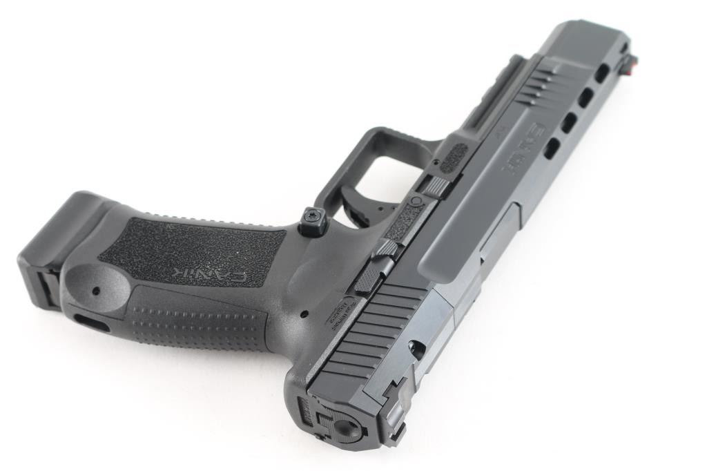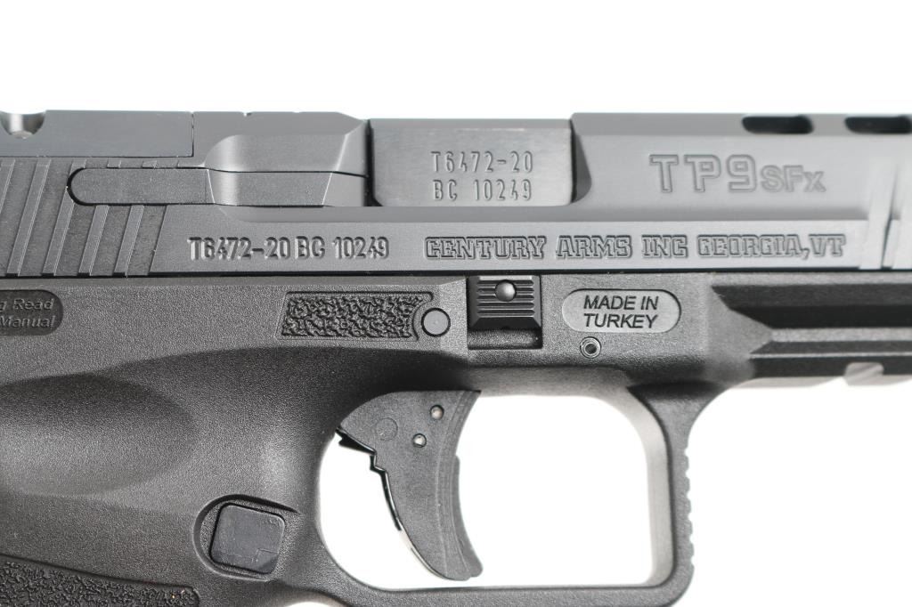 Turkish made striker fired semi-automatic full-size pistol chambered in 9x19mm. Imported by Century Arms of Georgia, V.T. Features matte black finish, extended slide with lightening cuts, 5.2" cold hammer forged barrel, dovetailed sights with fiber optic front insert, polymer frame with accessory rail & replaceable backstraps, polymer trigger with integral safety, cocked indicator, extended push button magazine release. Red fiber optic front sight, rear sight is mounted on a plate, replaceable with RMR sight plates (included). Includes the original factory hard case with manual, holster, cleaning tools, additional backstrap, (4) plates for RMR sight mounting, speed loader, (2 total) magazines. Overall condition is like new. Appears unfired. NRA Condition-Excellent+. Modern Firearm.