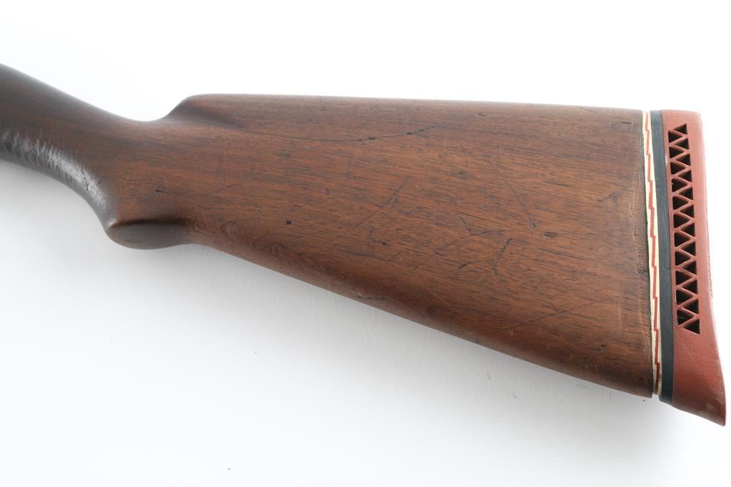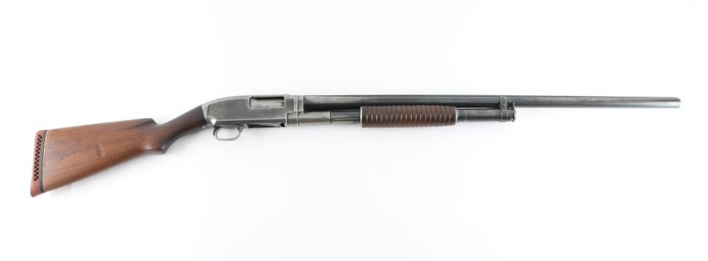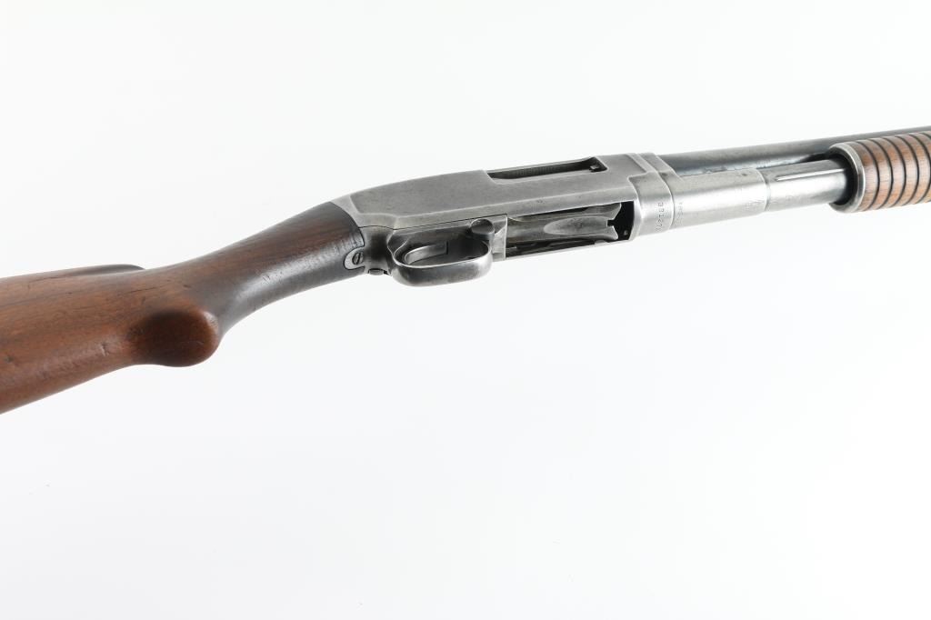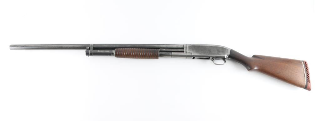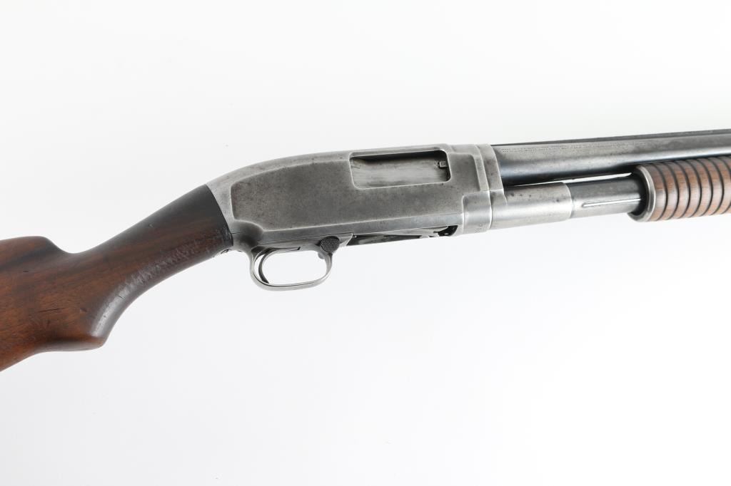 Vintage American made take down pump action shotgun manufactured circa 1923. Features 30" plain barrel, silver front bead, Full choke, blued finish, smooth wood semi-pistol grip stock & ribbed pump handle, Dupont rubber recoil pad, manual safety. Bore appears excellent/bright. Retains 30% finish with large bare metal areas, scratches, some darker bluing on barrel. Wood is very good condition with scratches, scrapes. Slide action is stiff, needs oil. Numbers match on receiver & extension. LOP is 14". NRA condition-Good. C&R Firearm