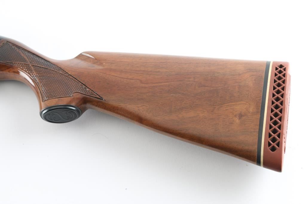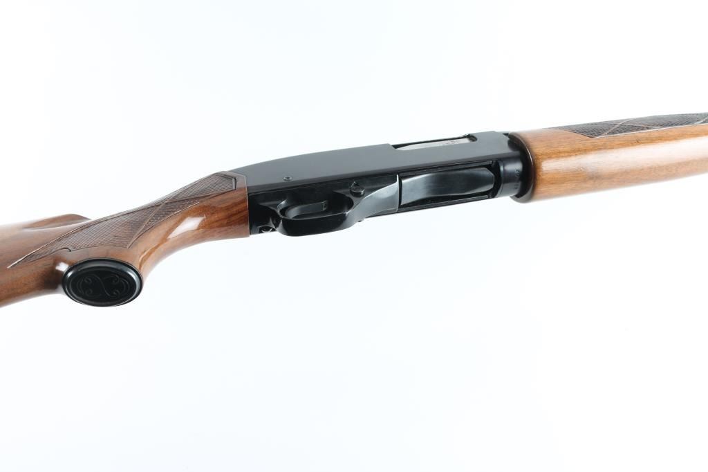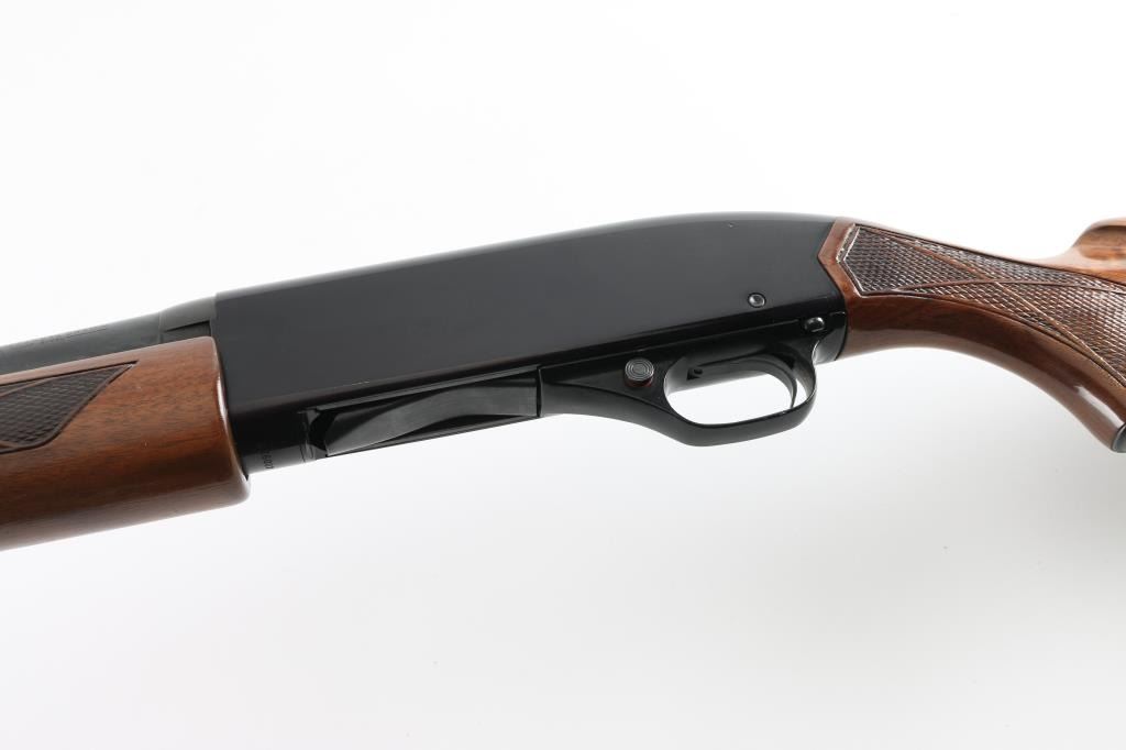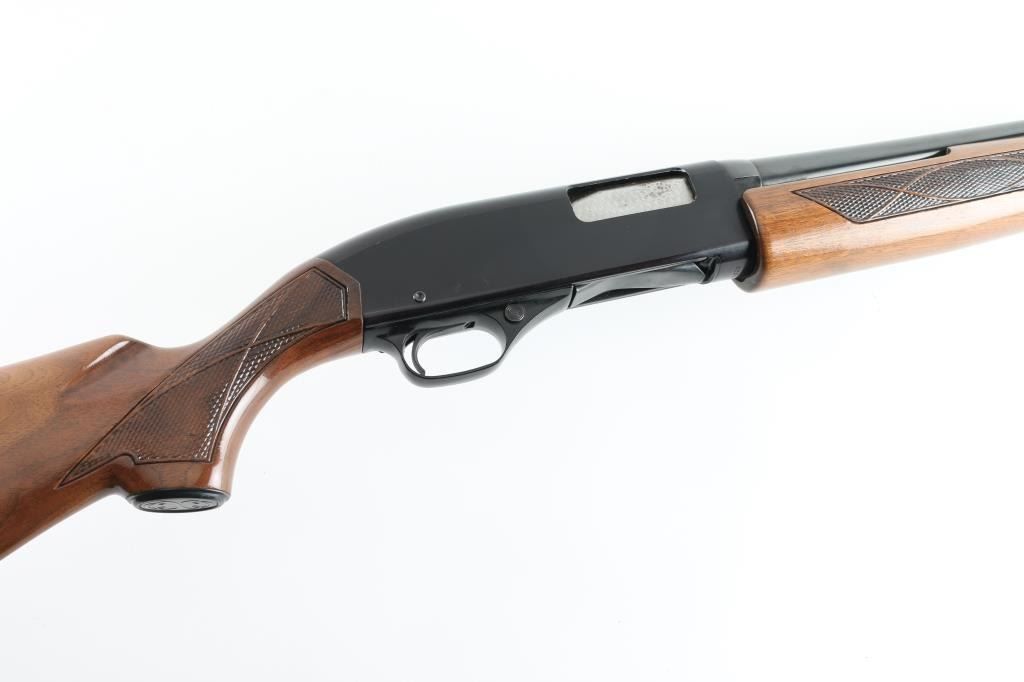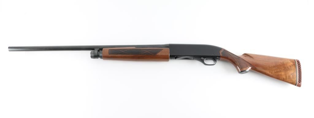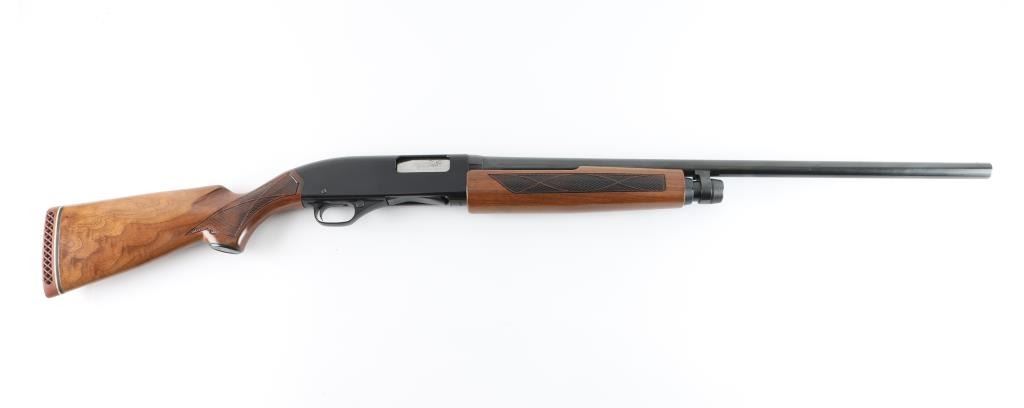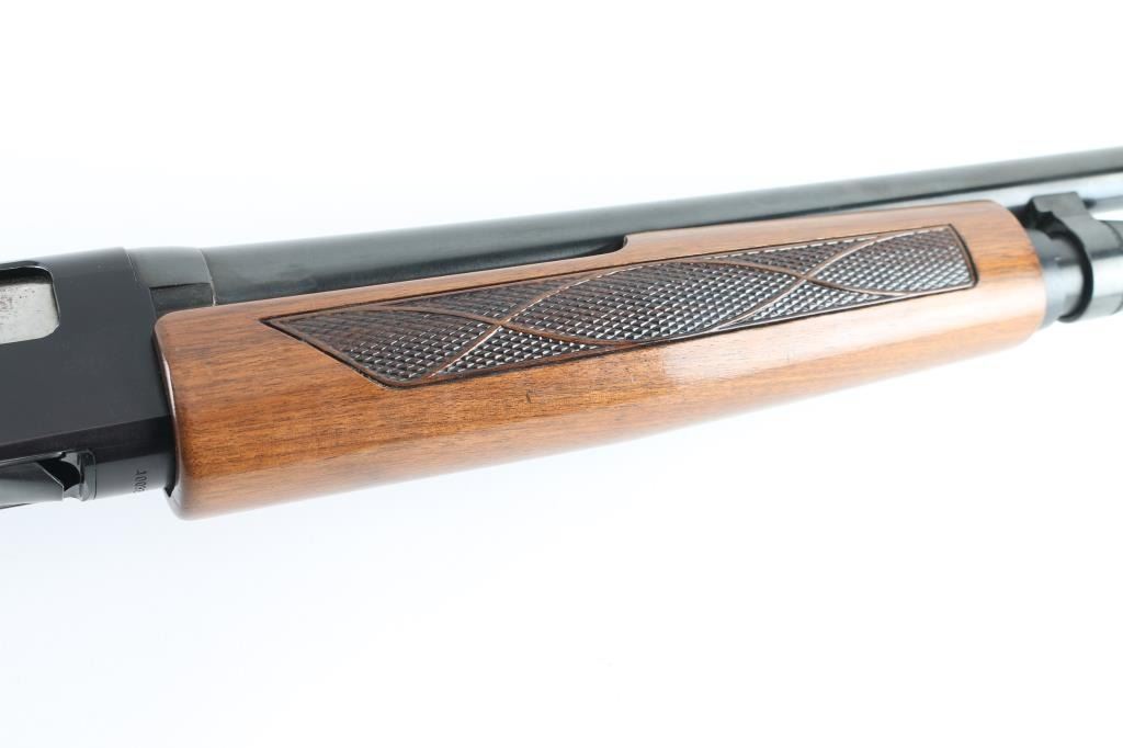 Slide action repeating shotgun chambered for 2 3/4" 16 gauge shells, manufactured 1965-83. Features a blued 26" round, full choke barrel, half-length tube magazine, silver bead front sight, smooth trigger with beveled edges, push button safety, jeweled bolt, black finished alloy receiver, press checkered walnut slide handle and semi-pistol grip shoulder stock with steel grip cap, factory red rubber recoil pad & 14" LOP. Shotgun retains approximately 97% of its original finish with two very minor spots of pin-prick pitting on the right receiver above the trigger. Action is smooth, the bore is excellent/bright , needs cleaning, and the wood stocks are very good with minor blemishes. NRA Condition-Very Good+. Modern Firearm
