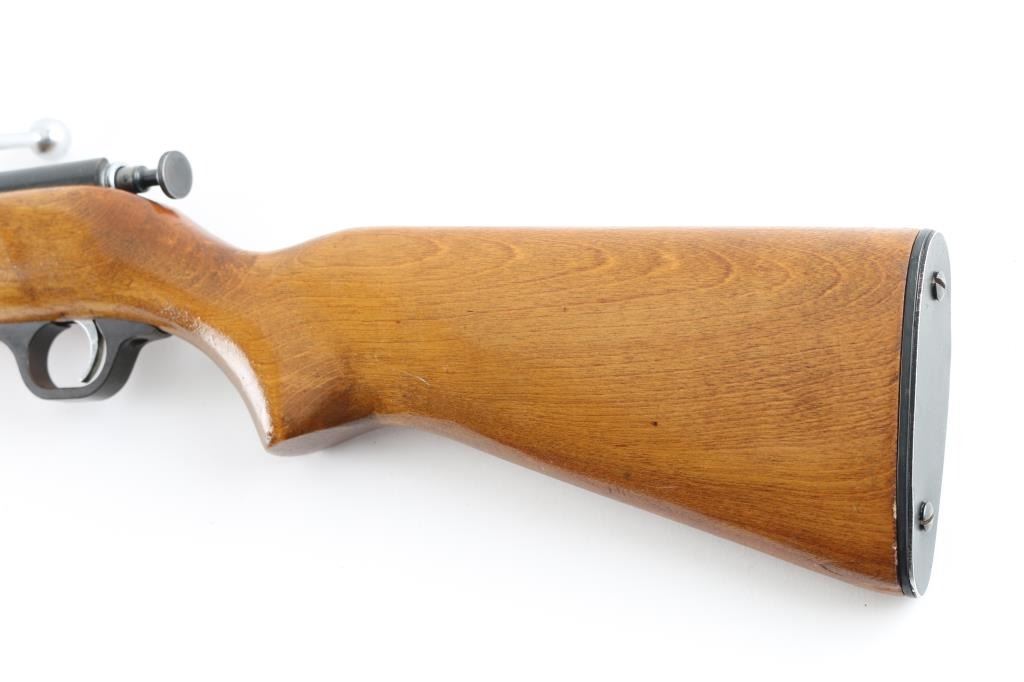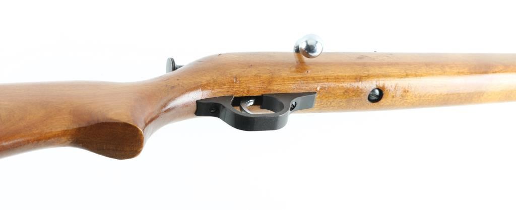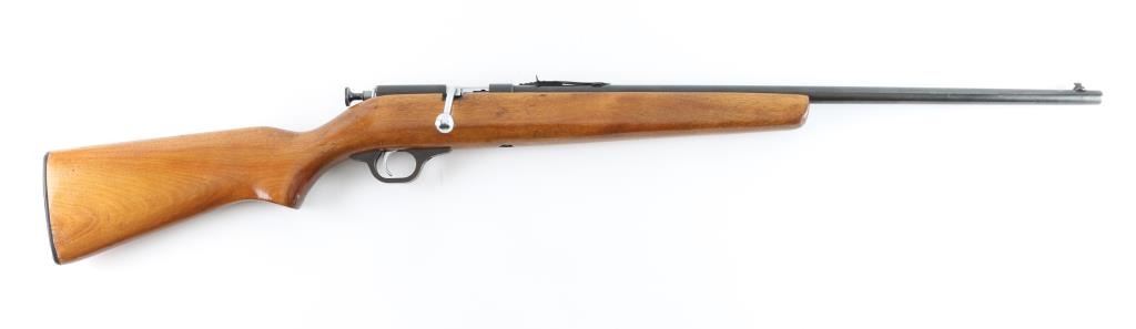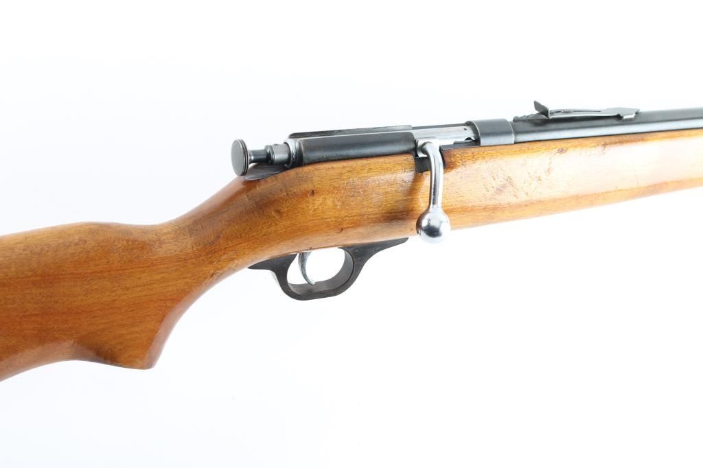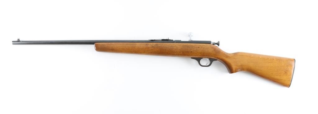 Trade name single shot bolt action rimfire rifle, made for Sears & Roebuck by Marlin (model 100). Features blued finish, smooth wood stock with curved wrist, 24" barrel, dovetailed blade front sight with beaded top, sporting rear sight, chrome plated bolt & trigger, thin flat metal buttplate with thin plastic spacer. Bolt must be manually cocked to fire. Bore is very good. Retains 85% finish with handling marks, edge losses, scuffs. Stock is very good with dents, varnished finish appears to be a re-finish. Buttplate appears to be a later replacement. Condition is NRA Very Good *** C&R Firearm ***