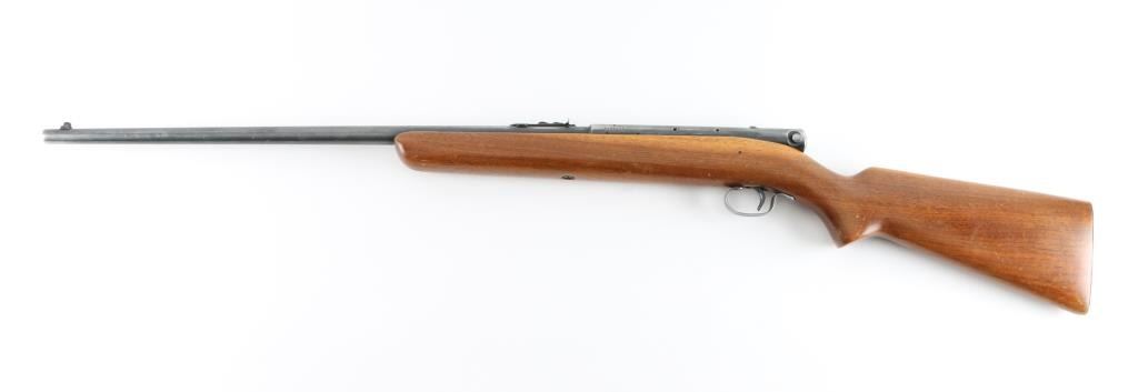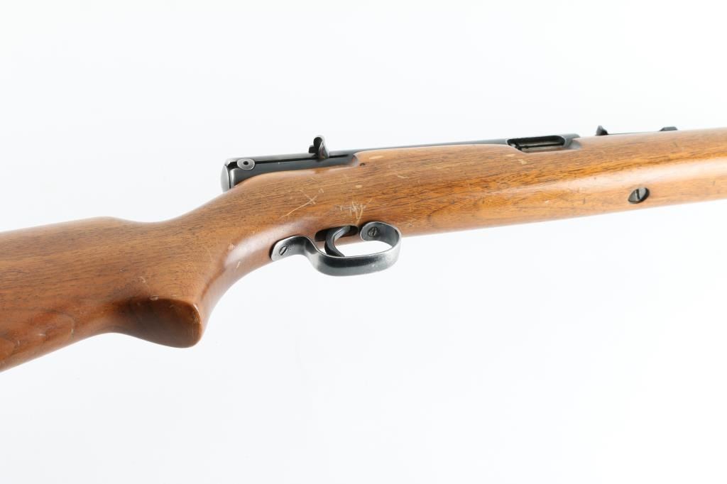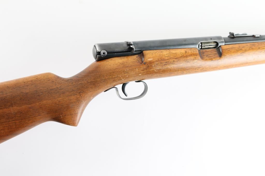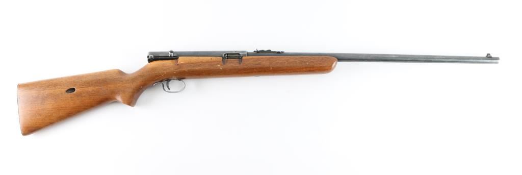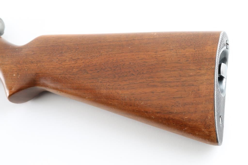 Semiautomatic rimfire rifle manufactured circa 1949. Features blued finish, wood stock, magazine tube in butt, buckhorn type sights, 22" barrel, manual safety on top of receiver. Bore is good condition, fairly bright. Retains about 80% of blue finish, with some handle loss, edge wear, and minor scratches . Stock is very good condition. Markings are readable. Someone has drilled/tapped the left side of the receiver for scope mount. Condition is NRA Good. *** C&R Firearm ***