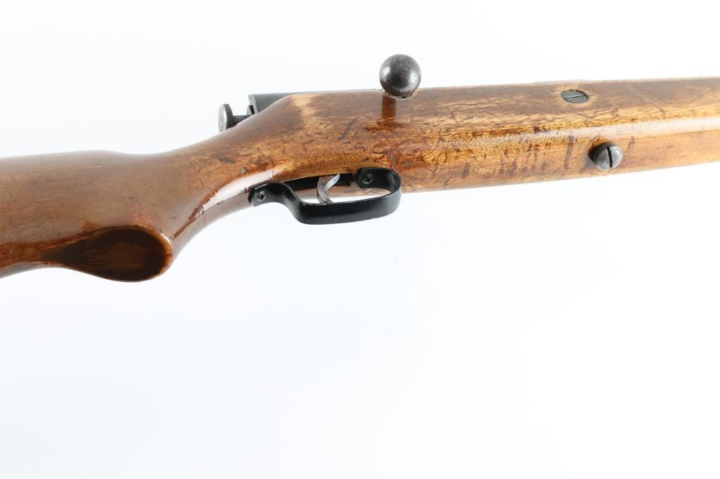 Vintage American made single shot bolt action shotgun chambered for 2 1/2" & 2 3/4" 20 gauge shells, full choke, manufactured pre-1968. Features a blued finish, 26" barrel with brass bead front sight, turned down bolt handle, manual safety, and smooth wood pistol grip shoulder stock with black painted steel buttplate. Shotgun exhibits approximately 40% of it's original blue, with the barrel turning a brown patina. Action is sound, the bore appears excellent , wood stock is good with handling loss to the finish, has been varnished. Sling swivels attached. 13.5" LOP. Condition is NRA Good. C&R firearm.