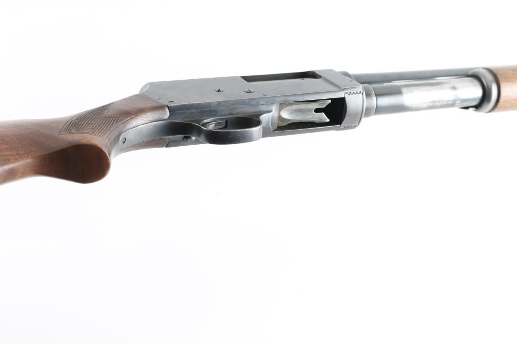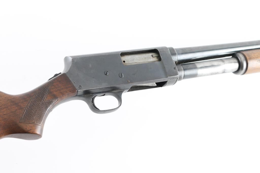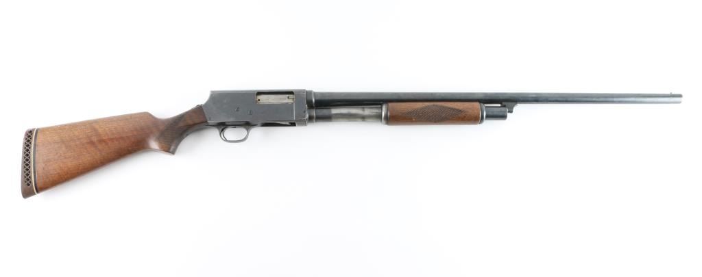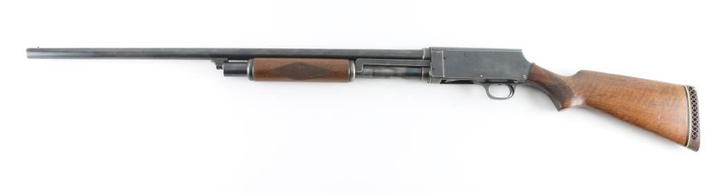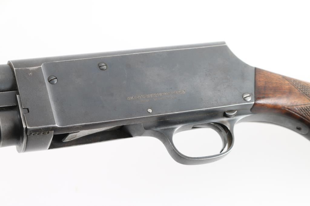 Vintage slide-action repeating shotgun chambered for 16 gauge shells. Browning patent made by Stevens for Montgomery Ward. Features a blued finish, 28" barrel with a bead front sight, 2 3/4" chamber, IM Choke, half length tube magazine, steel hump-back receiver, smooth trigger, sliding tang safety, checkered walnut slide handle and pistol grip shoulder stock with red vented rubber recoil pad. 14" LOP. Bore is very good. Metal finish looks good with some scuffs on the receiver, blue has dulled but is mostly all there, with friction wear on the tube. Action is smooth/tight. Wood is very good. NRA Condition-Very Good. C&R Firearm