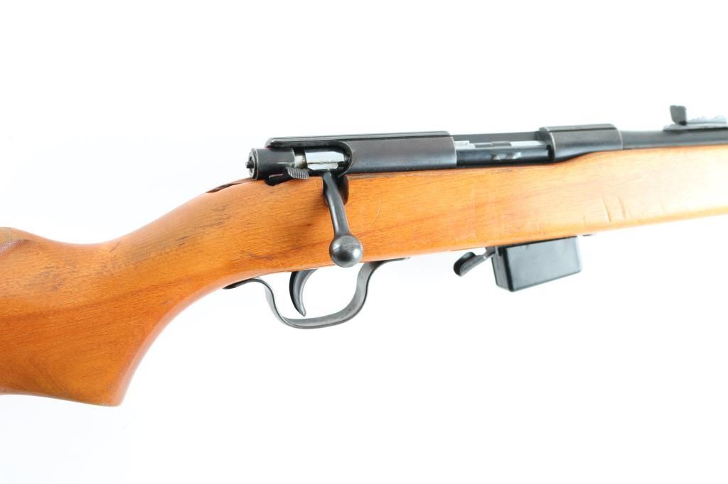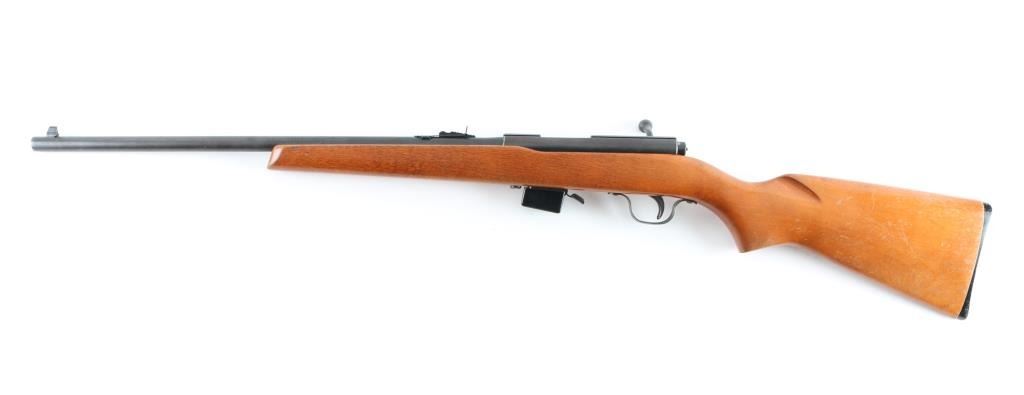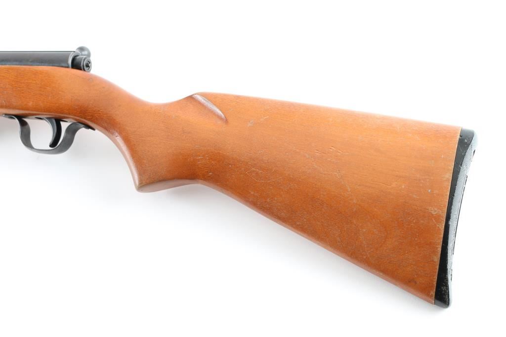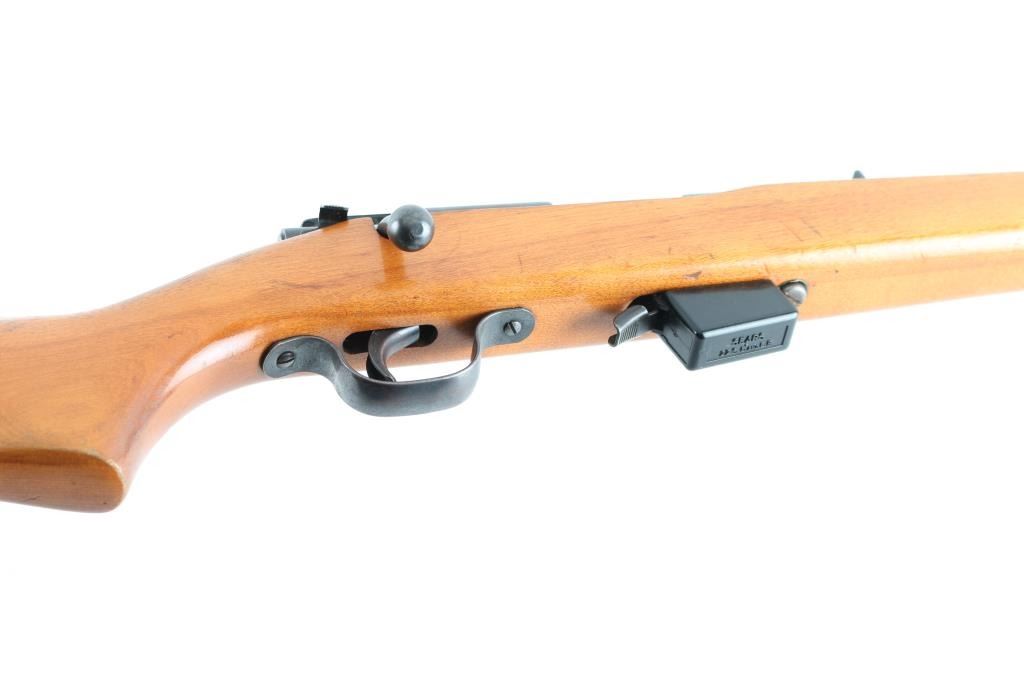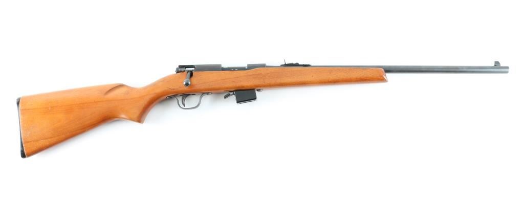 Vintage bolt-action rimfire rifle. A variant of the Winchester Model 131, Blue finish, walnut stock, fed from a detachable 7-rd Sears box magazine. Receiver slotted for scope mount, 21" barrel, with post/bead front, and rear sporting sights, manual safety. Factory plastic buttplate. Bore is excellent/bright, action is smooth, blue is good with some slight edge wear, and some slight areas of pin-prick pitting. Wood is very good with minor scratches/dings. NRA Condition-Very Good. C&R Firearm.