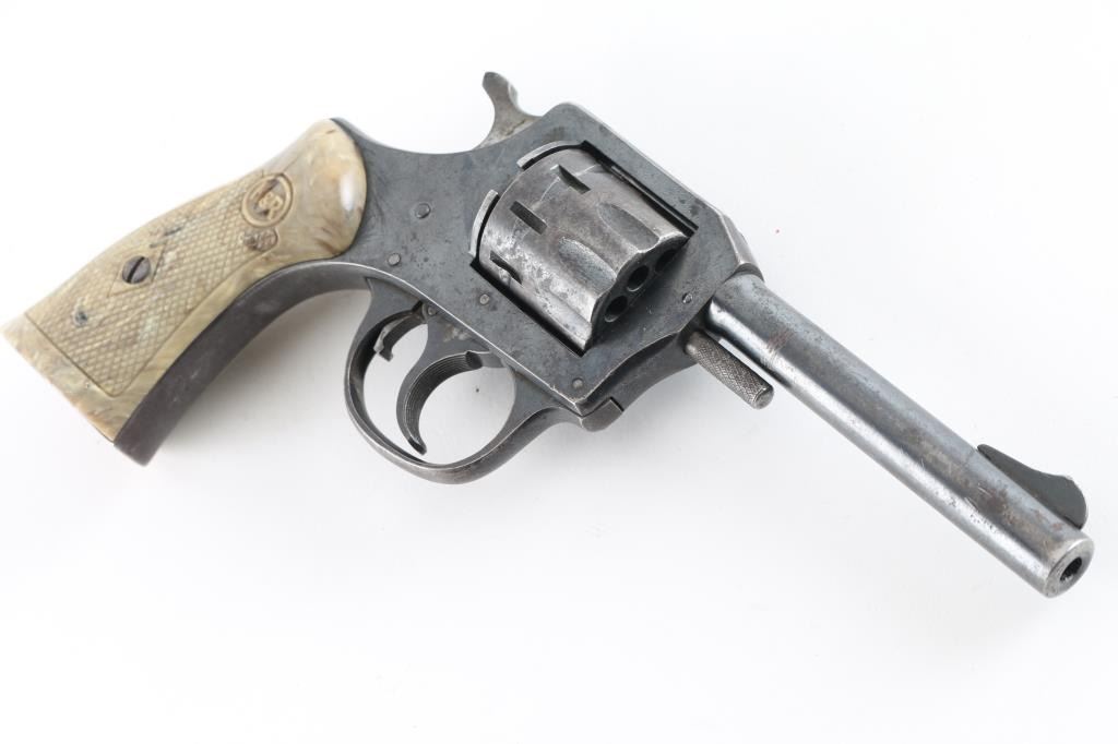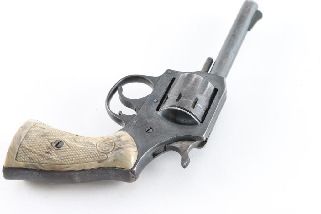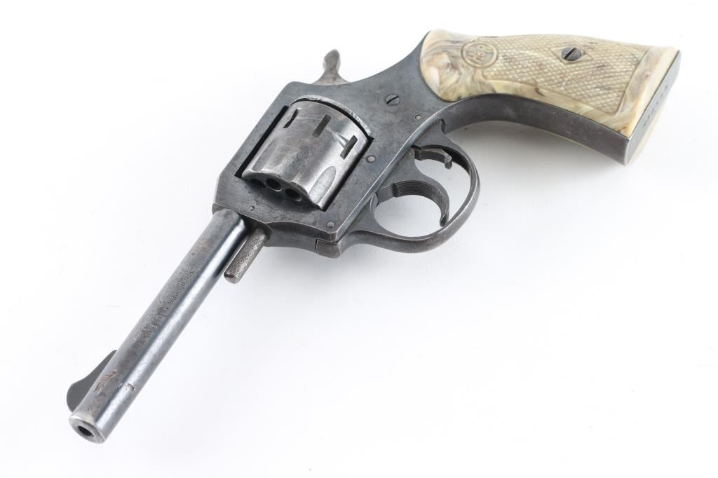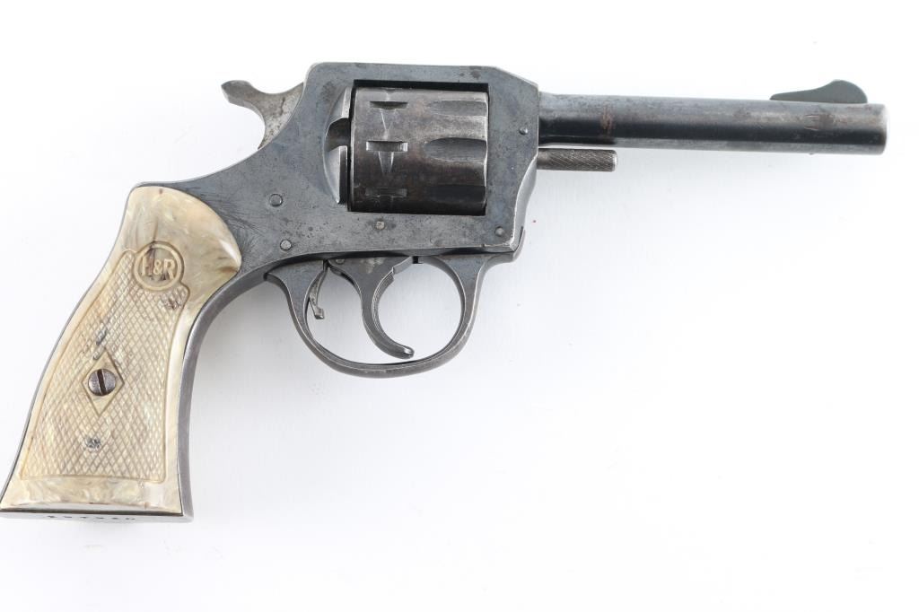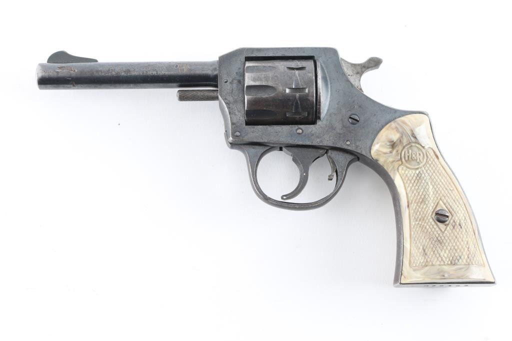 Revolver, Double-action. 9-shot. Blued metal finish, with white,-marbled , checkered plastic H&R grips. 4" barrel. Pull-pin cylinder release. H&R used the N prefix on the serial # in 1953. Action is smooth/tight. Open fixed sights, with sighting groove on the top of frame. Serrated trigger. Metal finish is about 60%, with scratches/dings, handling wear, some minor rust spots, wear to the edges, and drag lines on the cylinder. Grips are excellent. Some slight rust spots on the hammer. Bore and cylinder chambers appear good,but dirty. NRS Condition-Good. C&R Firearm.