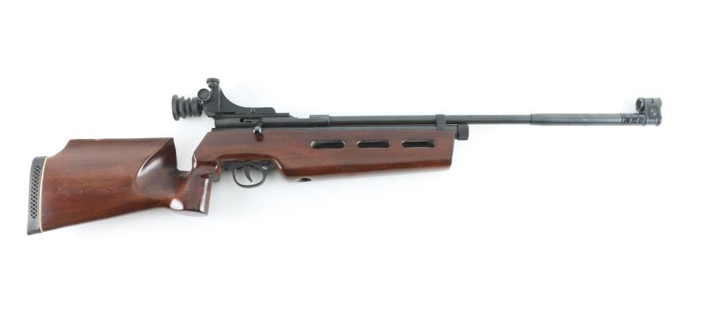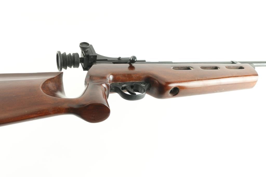 SN: 0601A20255. Chinese made , bolt action, Co2 powered, target air rifle, 27" barrel with globe front sight, and rear aperture peep sight with rubber eye cup, manual safety, rubber recoil pad, ported wood stock, with contoured pistol grip for right handed shooting. Appears to function, but could nut test it, no C02 cartridges. Very good condition. "Antique" Firearm