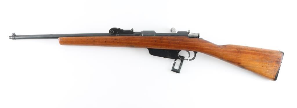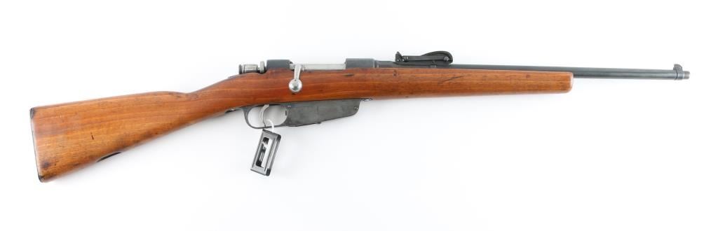 Sporterized Italian military bolt action service rifle chambered in 6.5x52mm, circa 1897. Features a blued finish, 18" barrel, blade front sight, adjustable V notch sight, bent bolt handle, rounded trigger and smooth wood straight grip shoulder stock with smooth Steel buttplate . Rifle exhibits approximately 960% of it's blued finish. Action is performs well, bore is rough, strong rifling. Stock has been shortened, handguard/cleaning rod removed, sling swivel removed, wood has been sanded. Comes with one En Bloc clip. Import marked on chamber, NRA Condition-Good/Sporterized. Antique Firearm.