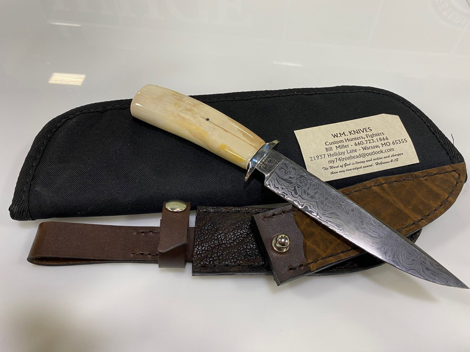 **MDF Endowment Item** Custom Built Demascus Hunter Knife by WM Knives with Fossil Walrus Ivory Handle, Nickle Silver Fittings, Elephant Hide Sheath - 15N20 Tool Steel, 1080 Spring Steel