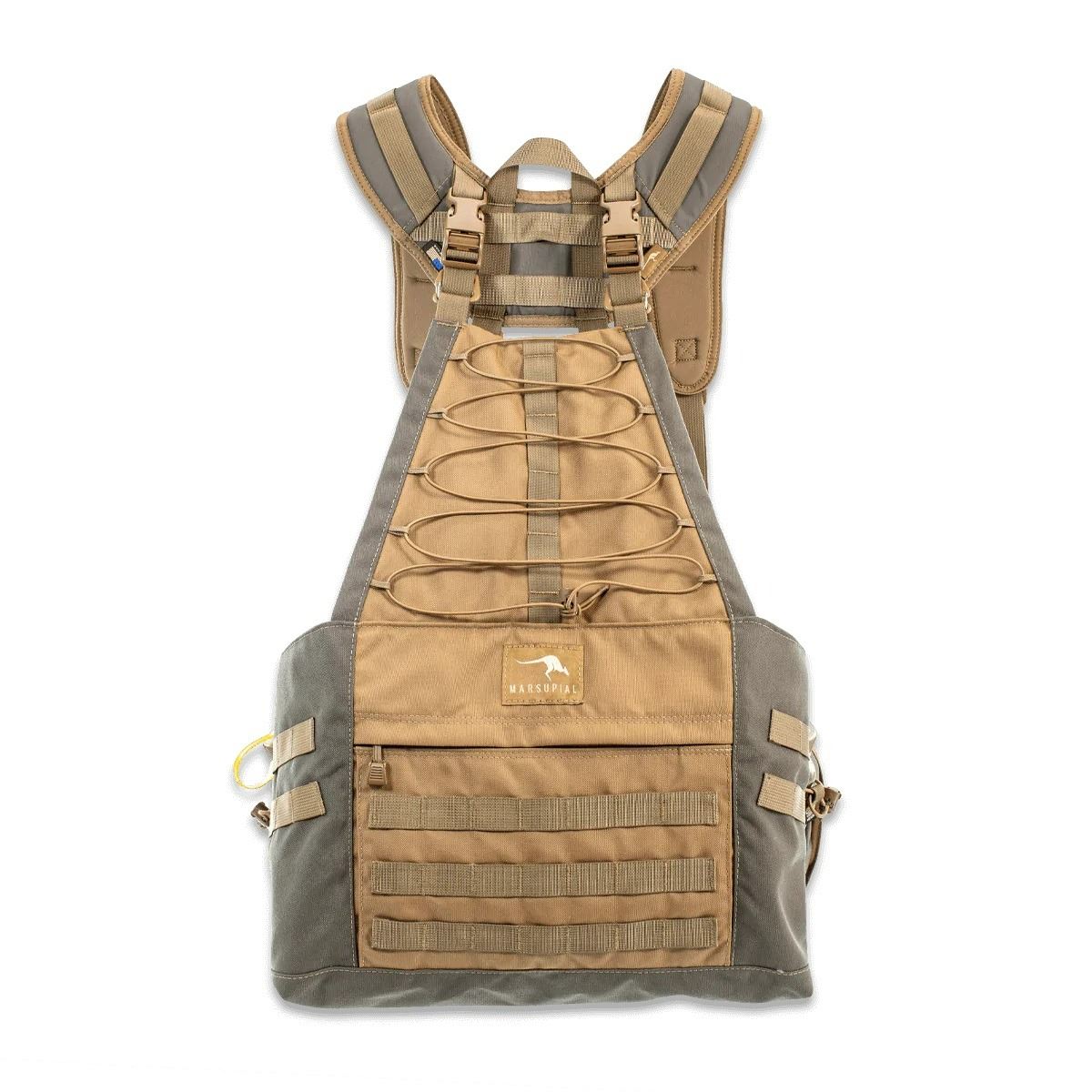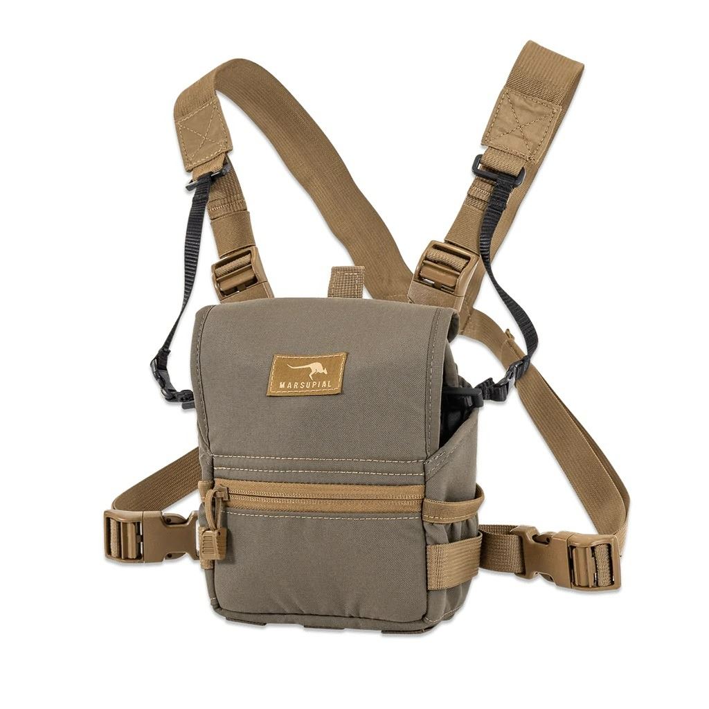 Years of feedback and testing have led to the design and creation of our new Enclosed Binocular Pack. Utilizing state of the art fabrics and features, the Enclosed Binocular Pack offers the same one-handed operation that Marsupial Gear is known for. This new pack uses our trademark front folding magnetic lid design, but adds another layer of protection. Taller sidewalls and overlapping wings, fully seal and protect your binoculars from the elements. MOLLE webbing has been added to the bottom of the pack for additional accessory attachment points. Durable stretch fabric allows you to carry more in the front and side pockets. Our modular design allows you to customize your chest pack with interchangeable accessories on both sides of the pack. For those of you who like a more sealed system, this is the pack for you.