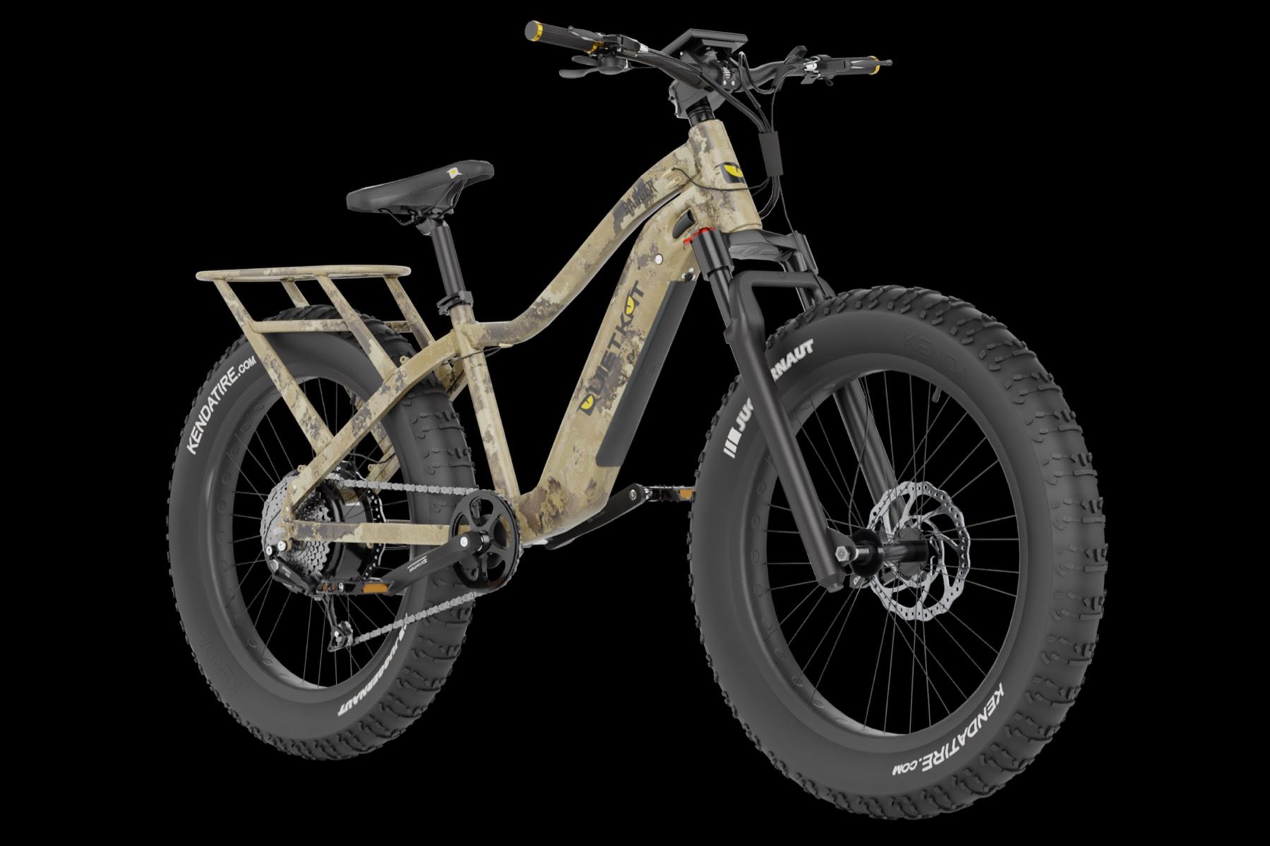 The Ultimate All-terrain E-Bike. This QuietKat Ranger 750 electric bike is in Veil Poseidon Dry Camo and comes with a 750-watt hub drive motor, integrated battery, 7-speed drivetrain, mechanical disk brakes, and premium components. Built to conquer tough terrain, long commutes, backcountry hunts, and much more! This go-anywhere electric bike modes include 5 levels of pedal assist, removable throttle, and walk assist mode. The 12.8AH/48V 614WH battery that can take you up to 48 miles on a single charge! The bike weighs 65 pounds and can carry 325 pounds with its Kenda Juggernaut 26" x 4.5" tires. This bike is offered in the 17" Medium size frame to fit most riders. This package also includes (1) two-wheel all-terrain trailer, and (2) waterproof pannier bags to make this the ultimate off-road package! QuietKat is the leader in off road electric biking!