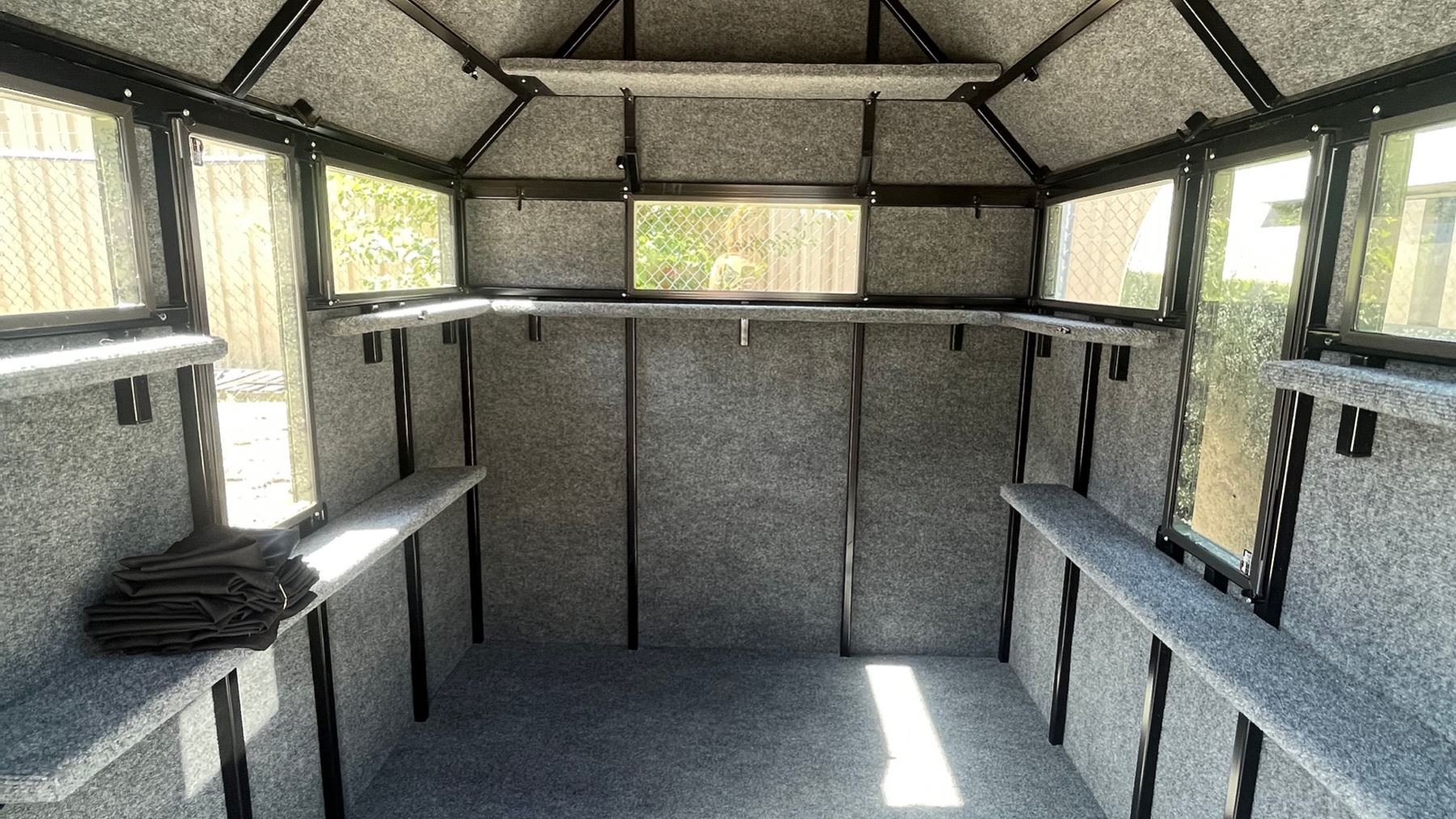 - Blackout curtains with magnetic ends made of gabardine fabric (a very opaque, durable, hard-wearing material) to block movement inside the hide