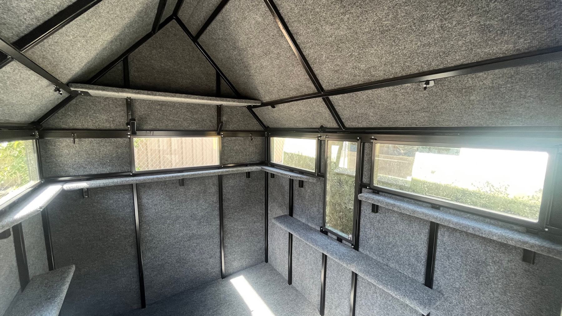 - 7 glass windows measuring 24"x10", flip-up style that holds open/closed