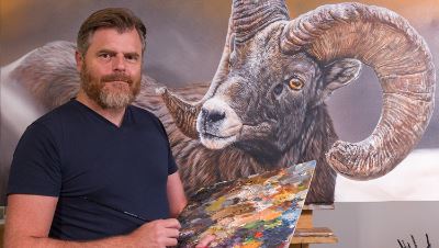 This beautiful oil painting shows off a Big Horn Sheep (Ovis canadensis) standing strong.