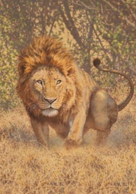 The image titled The Reckonning” depicts a majestic male lion freezing the observer in place with his non-blinking stare.