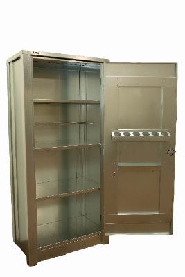 Four fixed full-size shelves and one 10-in half shelf, three 3-in heavy duty hinges per door, riveted stiffener channels on all doors, center supports on all full-size shelves, and a spray can caddy and small part tray on both doors.