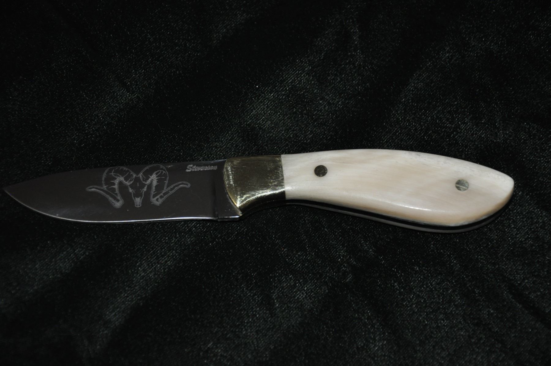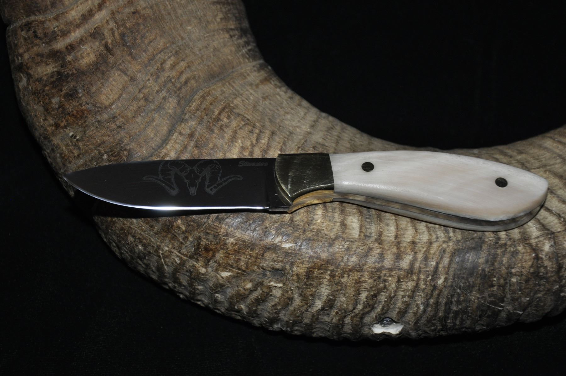 CUSTOM KNIFE FEATURING RWL 34 BLADE W/DALL’S SHEEP HORN ON 1 SIDE AND STONE’S ON THE OTHER - SKULL LOGOS ON THE BLADE
