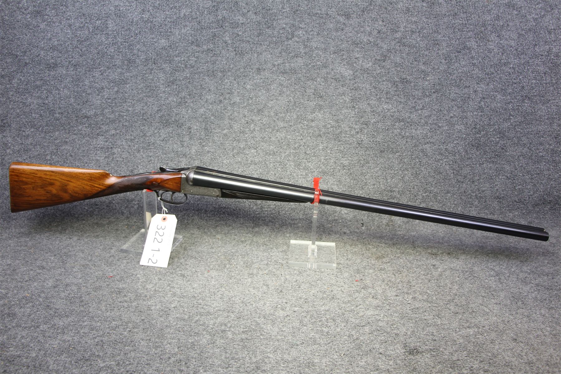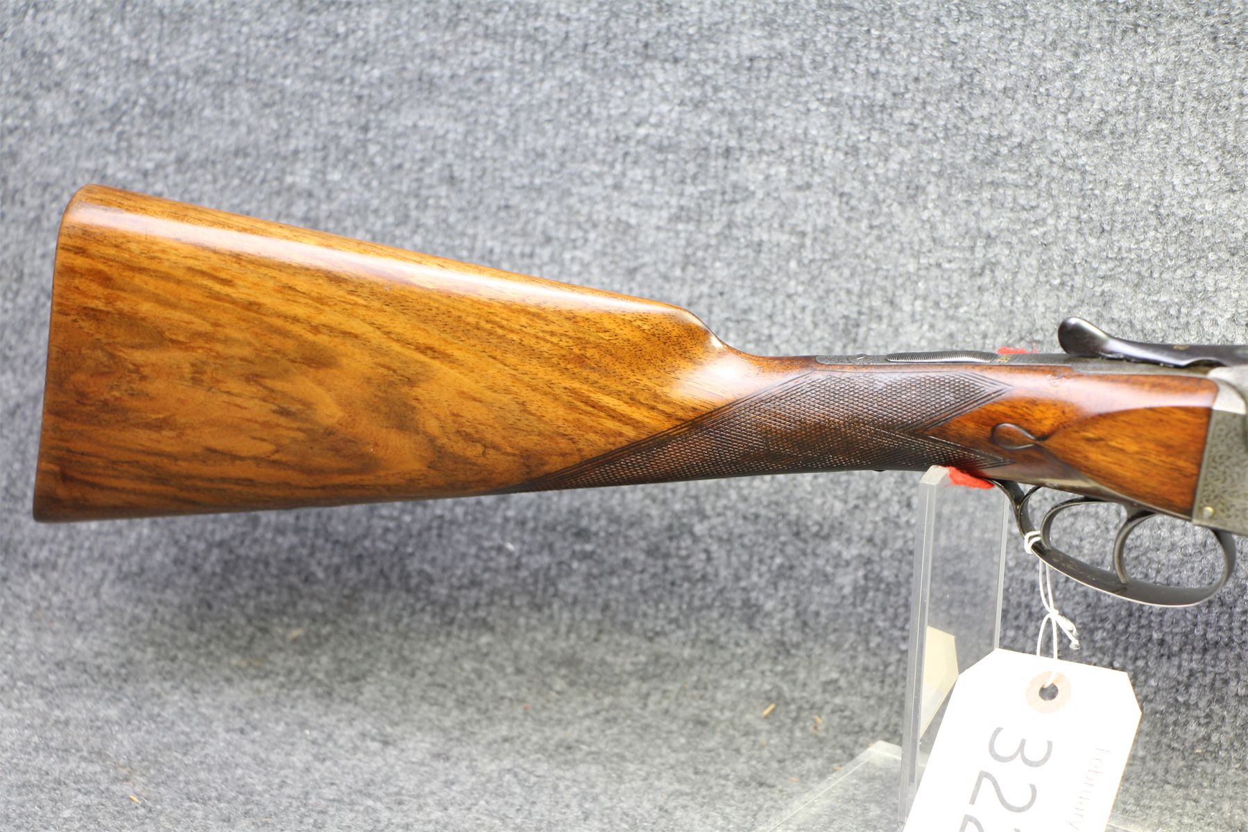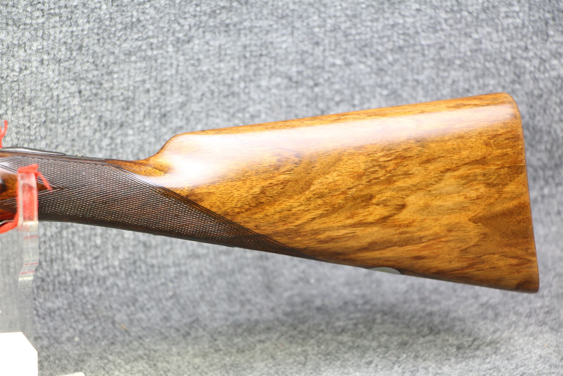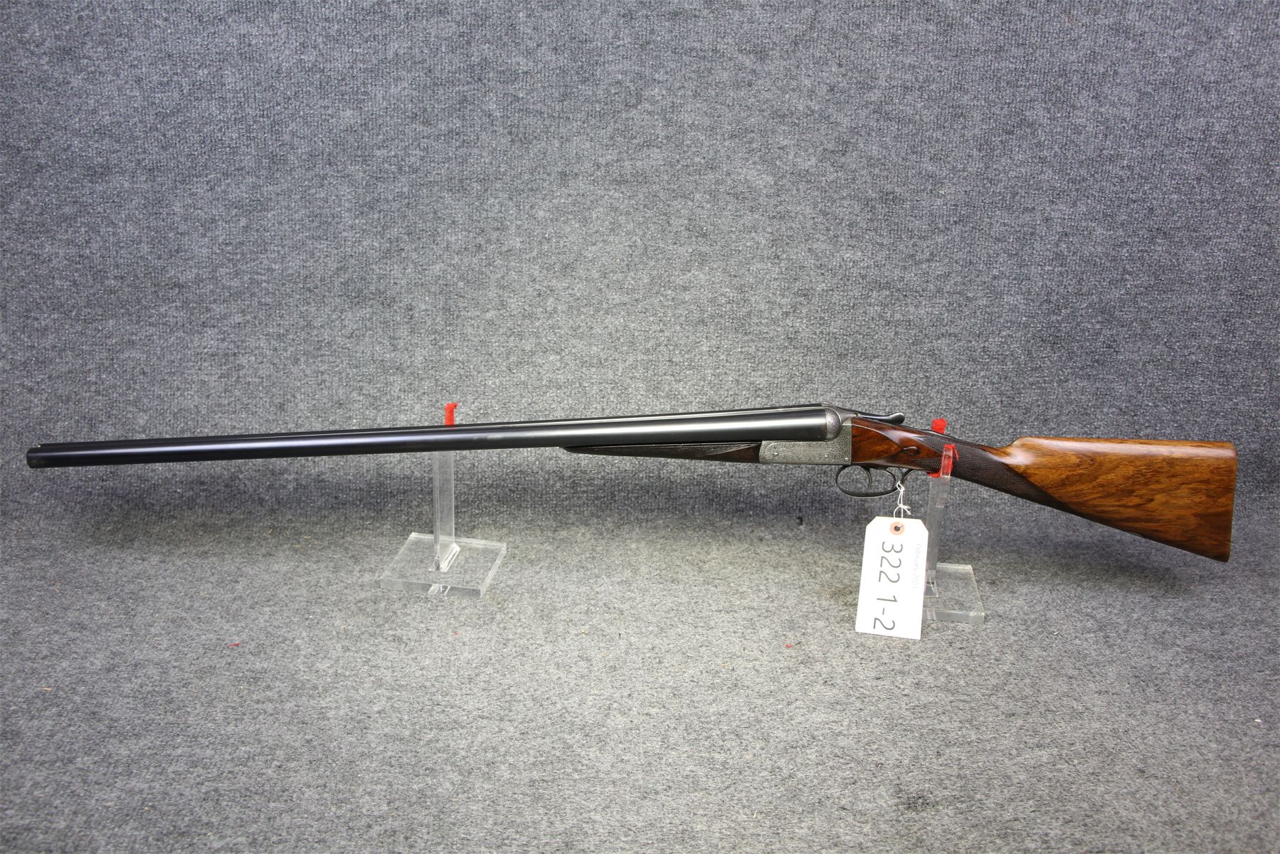 In amazing condition. Fine English upland double gun. Fine scroll engraving on this box lock. European walnut stock has minor handling marks. Very shallow pitting at the muzzle and chamber ends. Comes with English hard case with cleaning rod and tips. Apparently, this gun went back to England and got re-chambered and re-proofed.