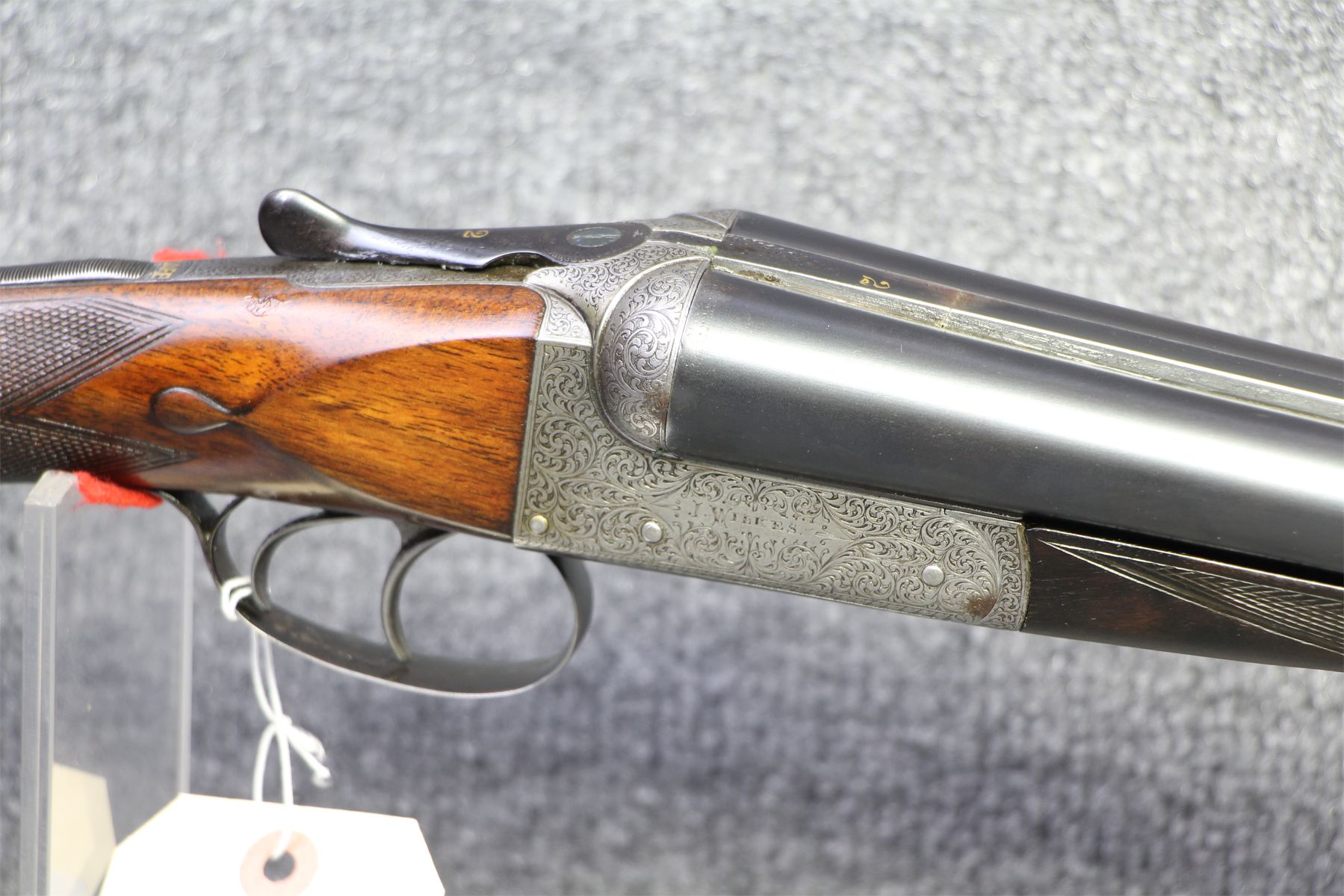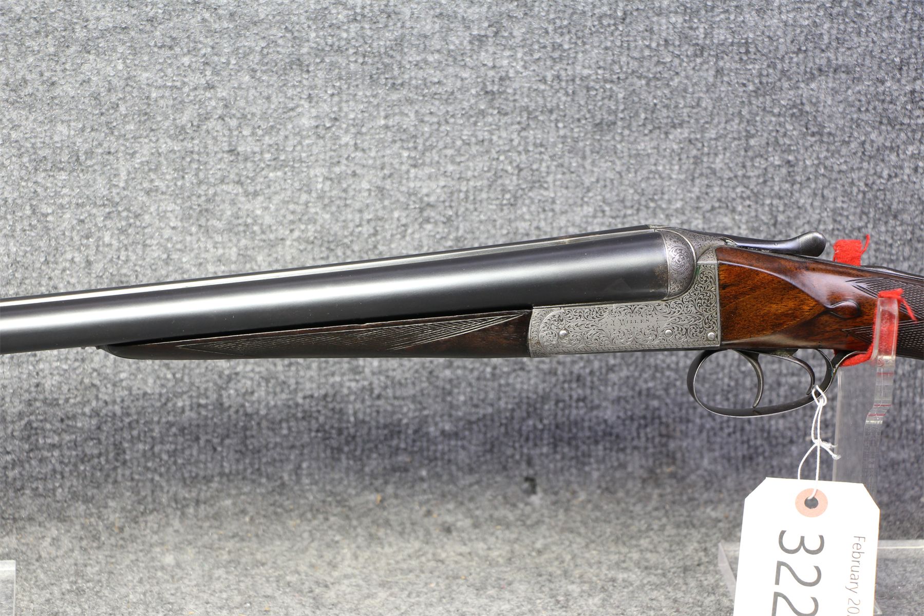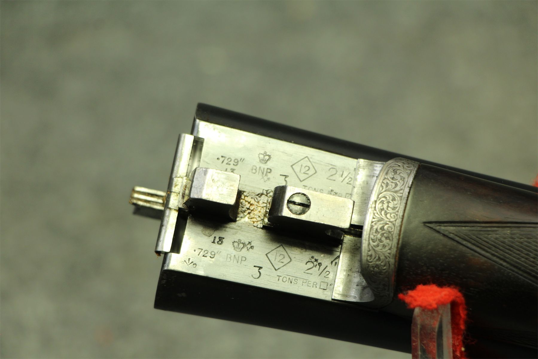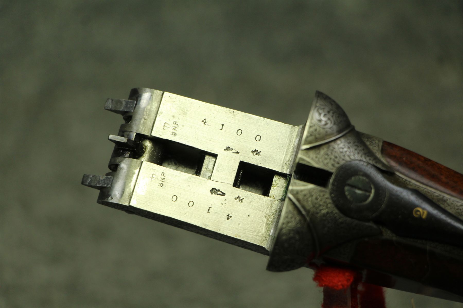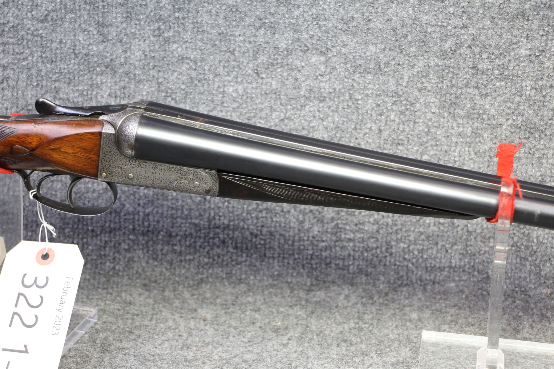 In amazing condition. Fine English upland double gun. Fine scroll engraving on this box lock. European walnut stock has minor handling marks. Very shallow pitting at the muzzle and chamber ends. Comes with English hard case with cleaning rod and tips. Apparently, this gun went back to England and got re-chambered and re-proofed.