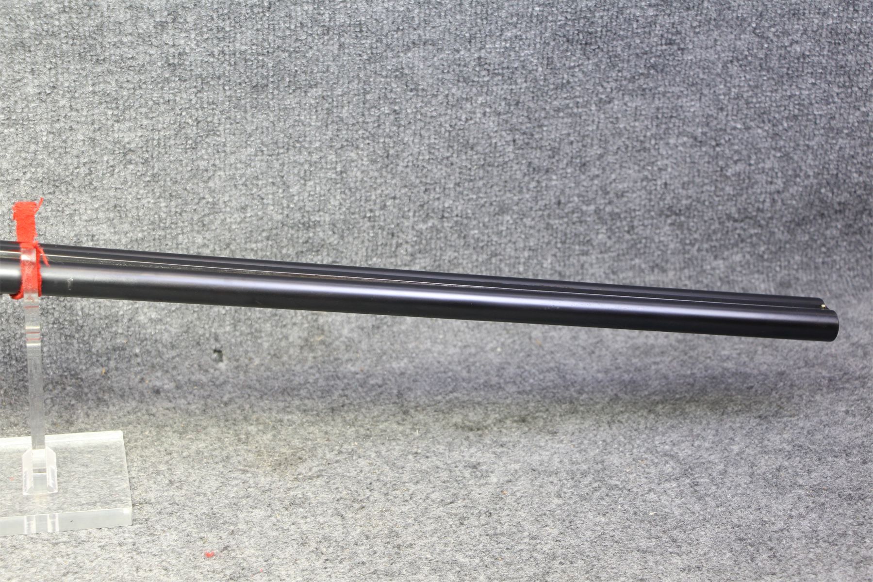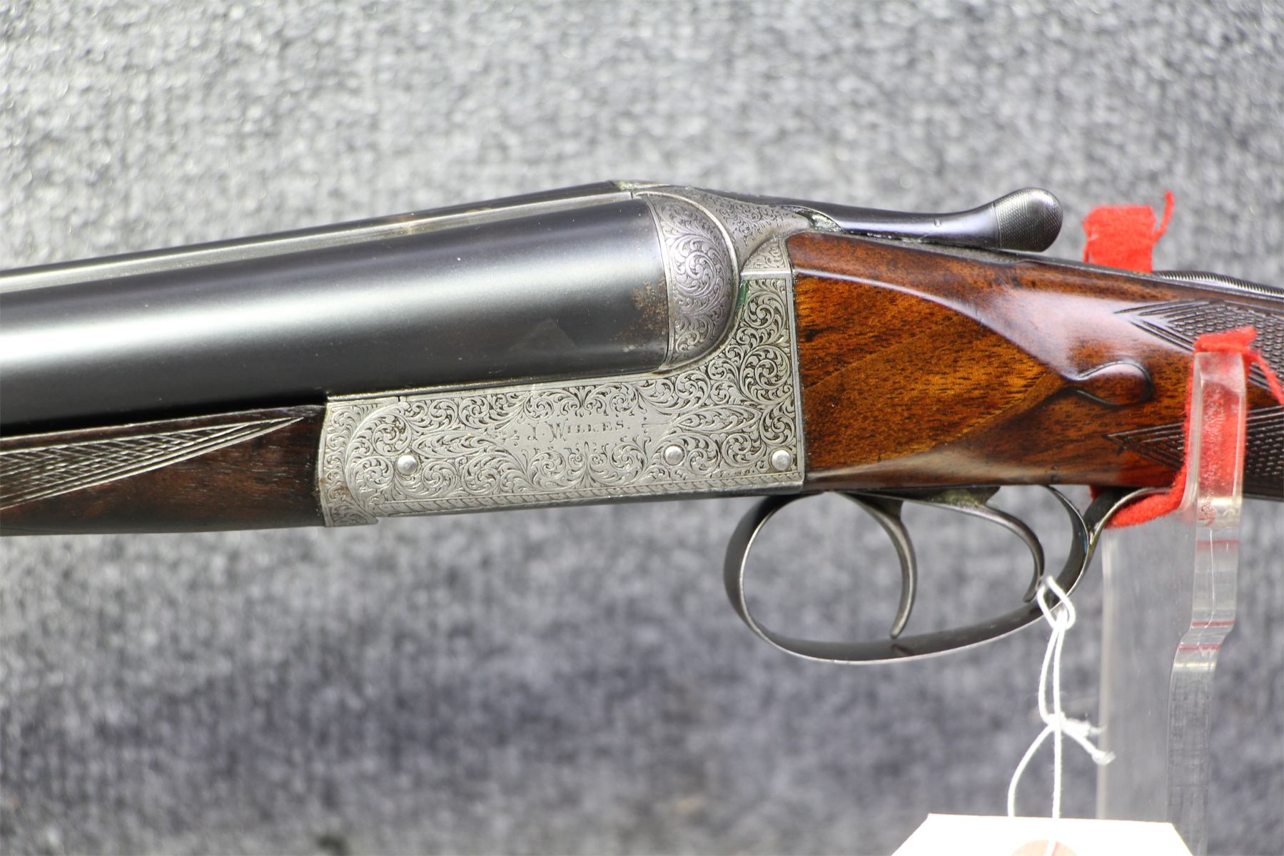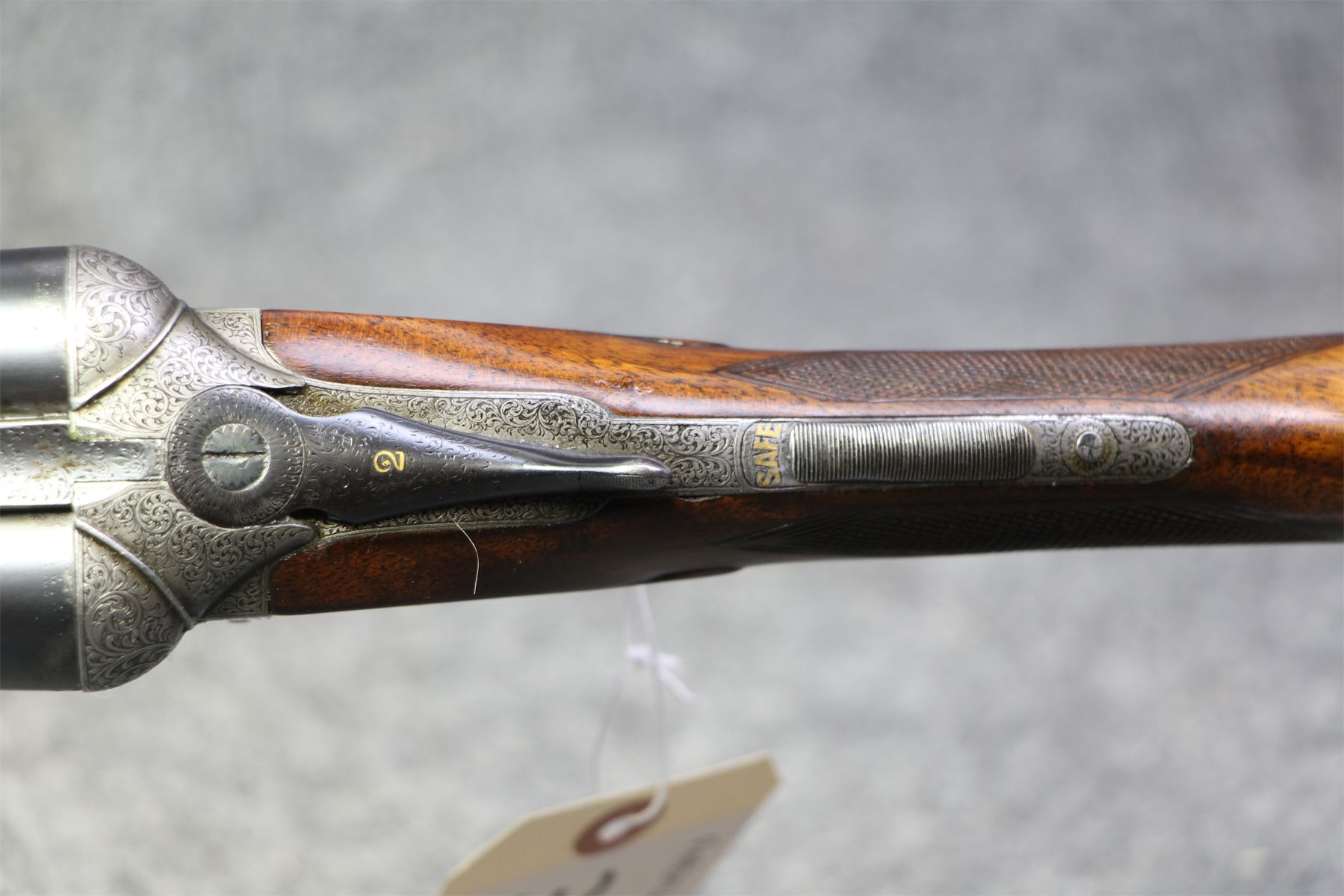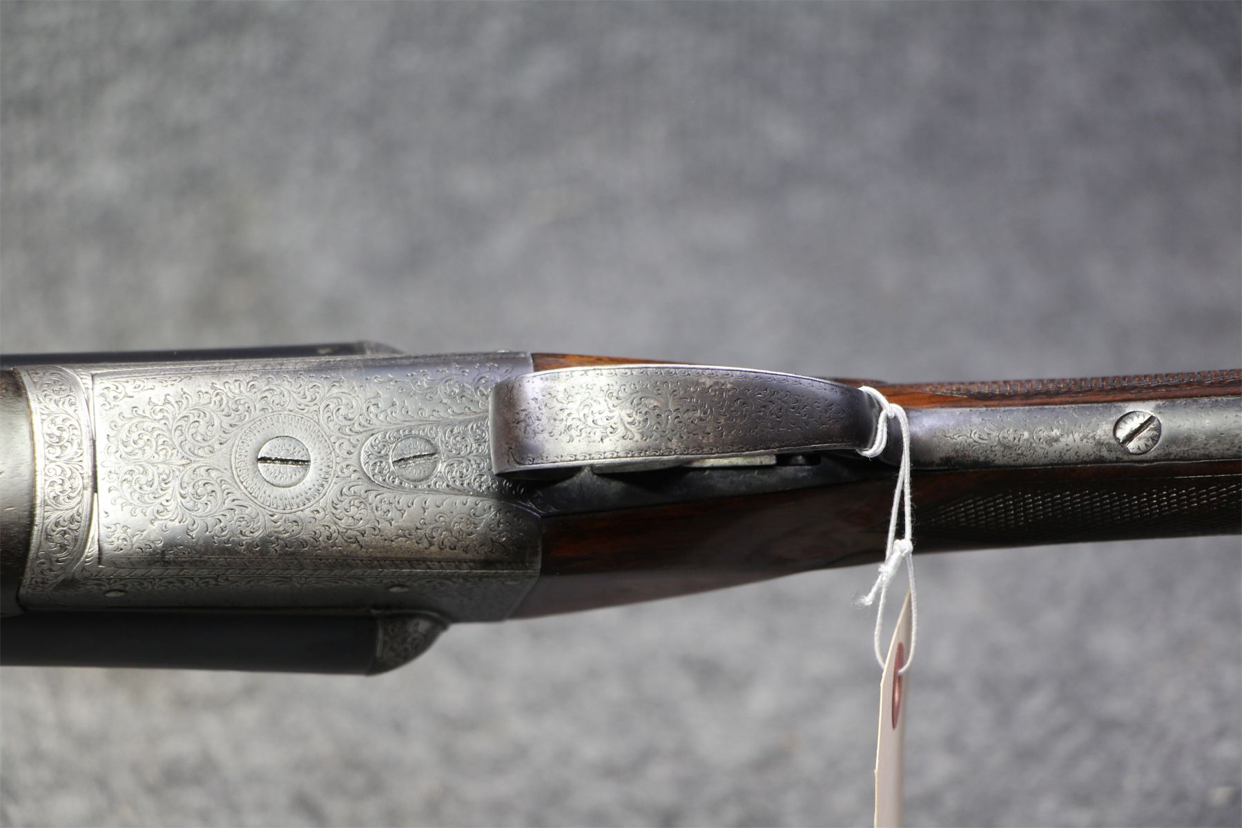 In amazing condition. Fine English upland double gun. Fine scroll engraving on this box lock. European walnut stock has minor handling marks. Very shallow pitting at the muzzle and chamber ends. Comes with English hard case with cleaning rod and tips. Apparently, this gun went back to England and got re-chambered and re-proofed.