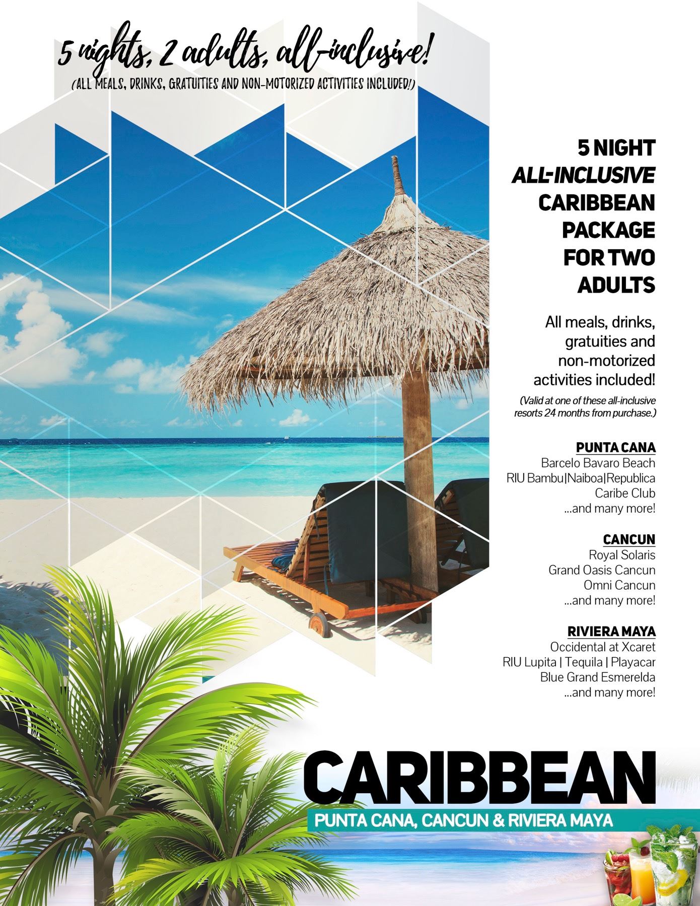 Grab your swimming suits and suntan oil and head for the beach! All-inclusive Caribbean vacation package for two adults. Your choice of Punta Cana, Cancun, and Riviera Maya, over 35 resorts to choose from, your choice. Package includes hotel for 5-nights, all meals, drinks, non-motorized activities and gratuities. Not included are airfare and transfers. Your vacation package is valid at one of these all-inclusive resorts for 24 months from your date of purchase.