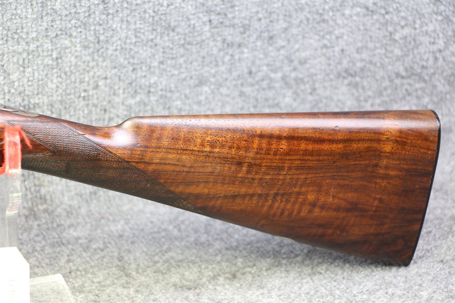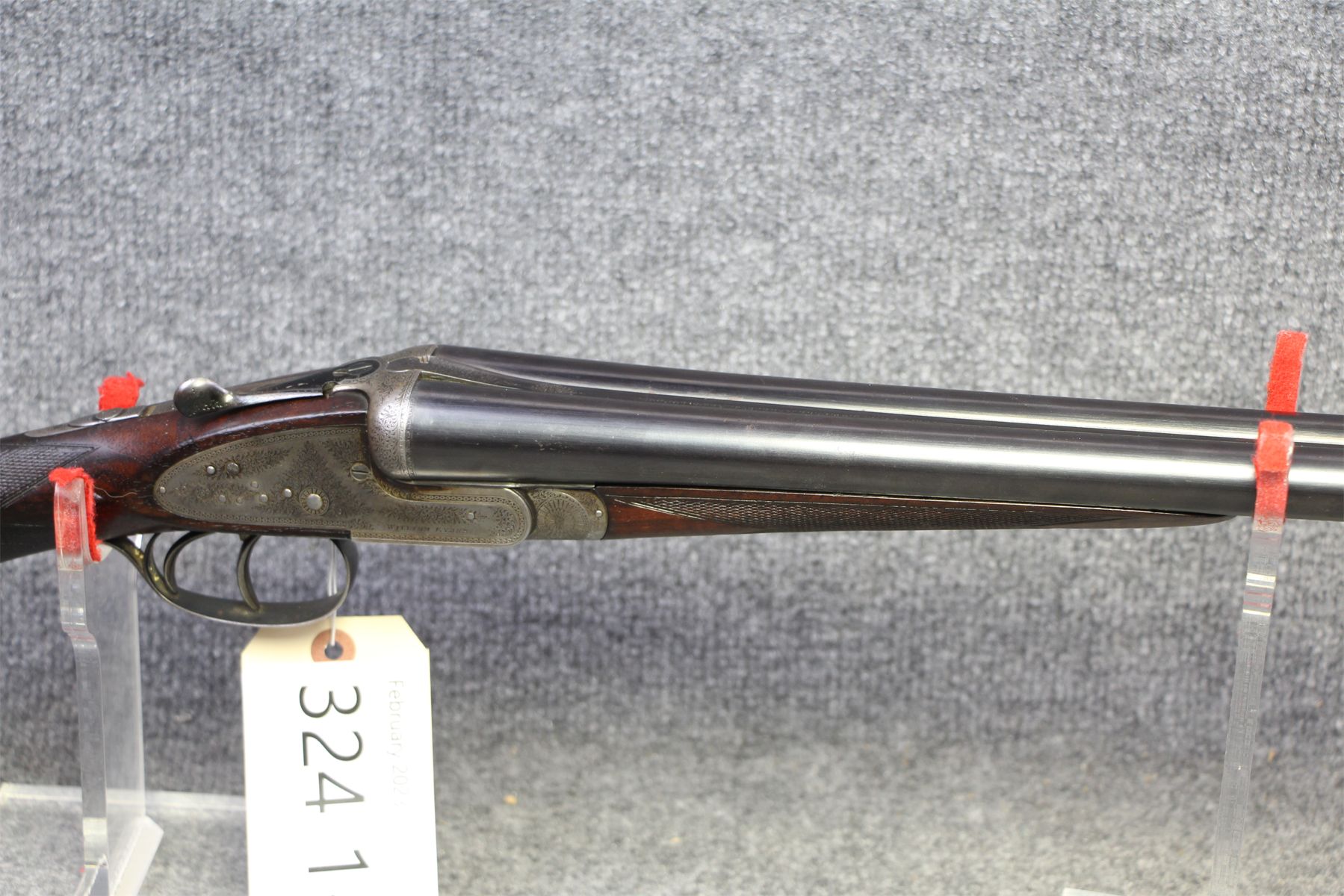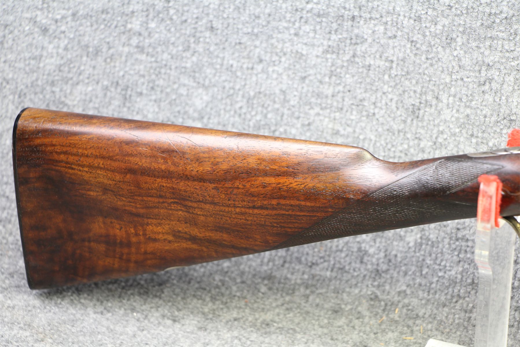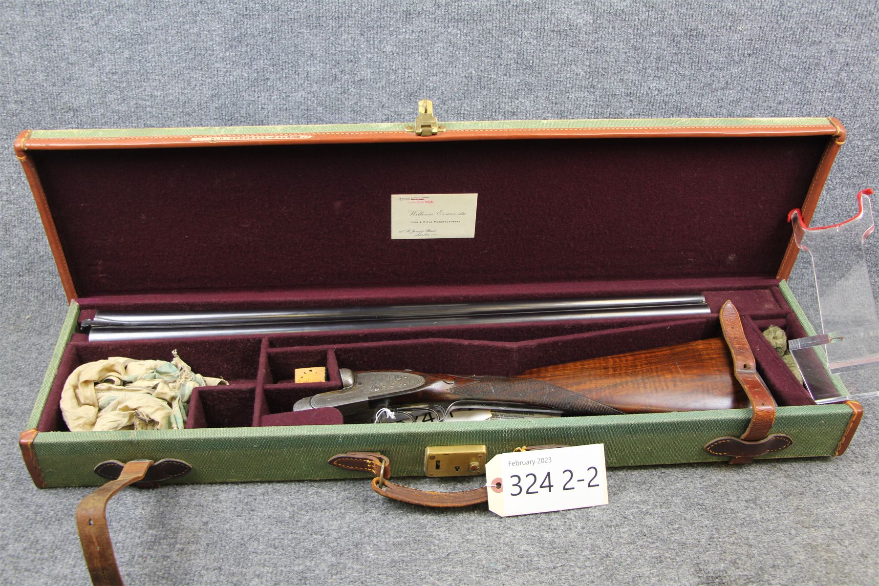 Gorgeous English sidelock upland double. Finely engraved. Doll head lug. Tiniest handling marks. No dings on the barrels. Slight freckling where held. No cracks nor gouges in the wood and only very shallow dings. Comes with William Evans hard case in very good condition. Cleaning rod and tips included.
