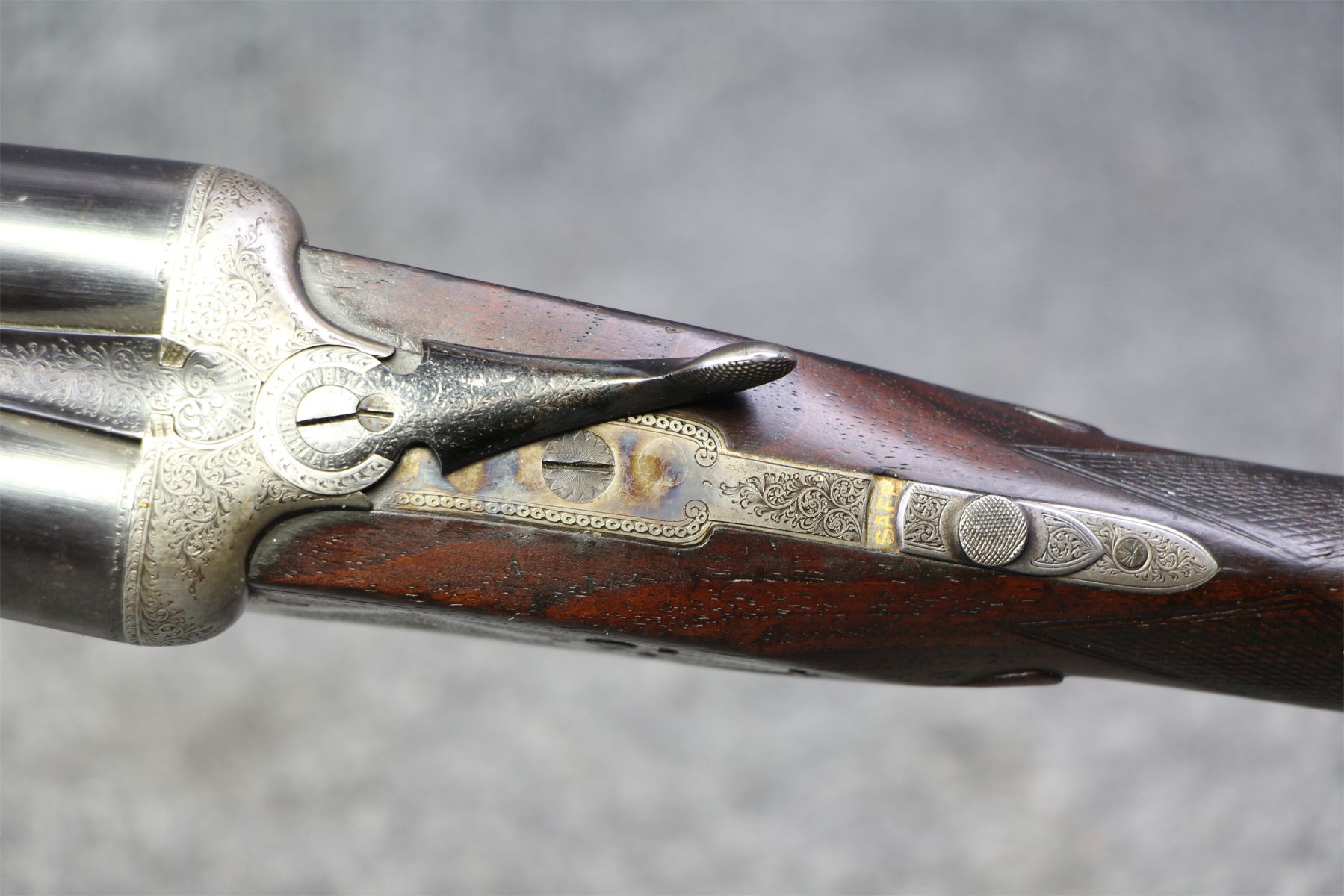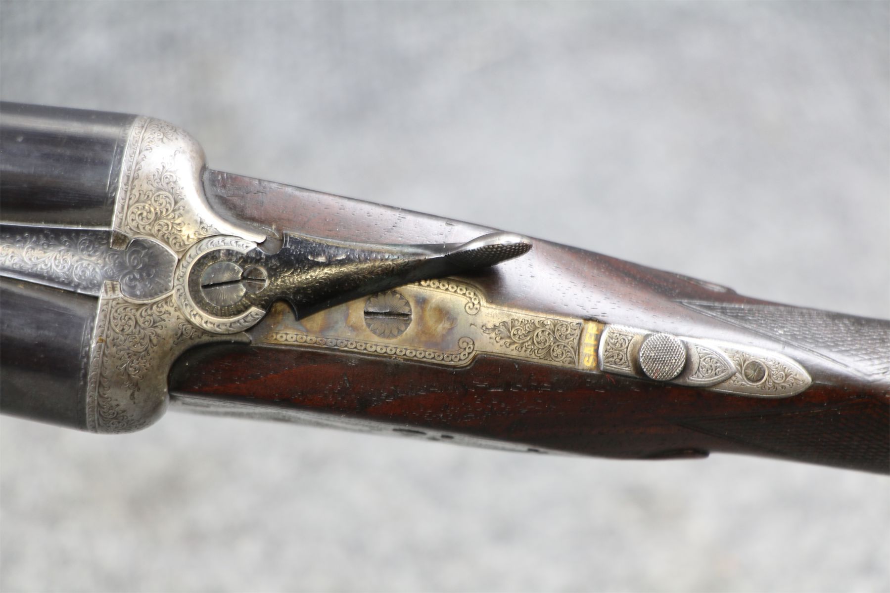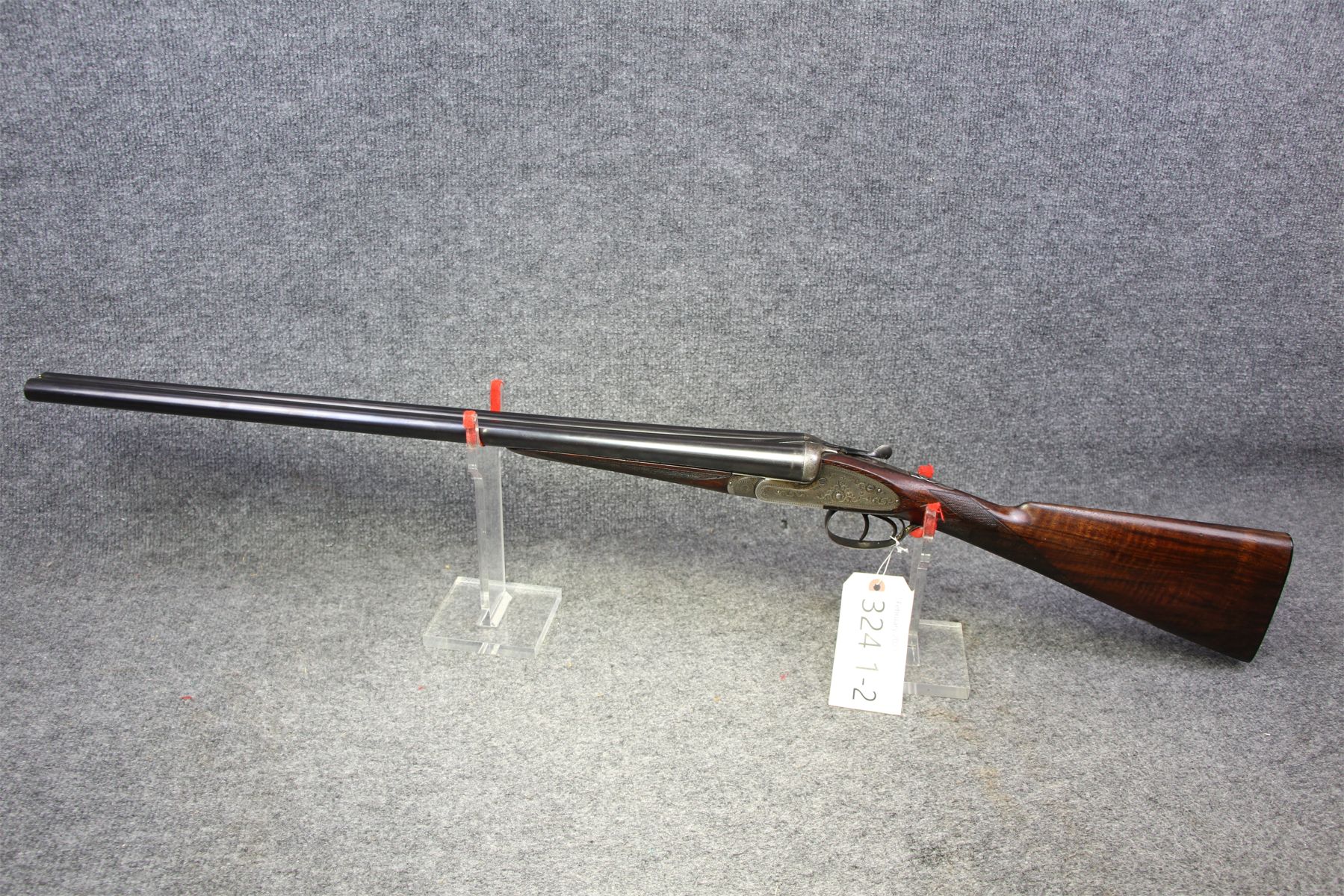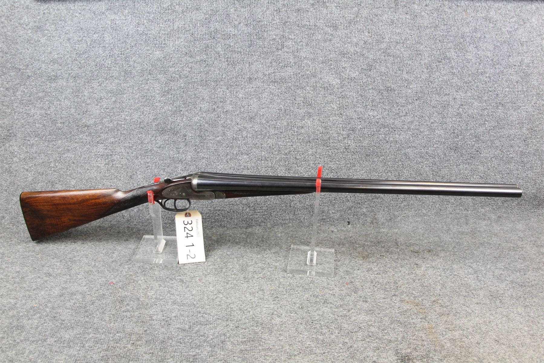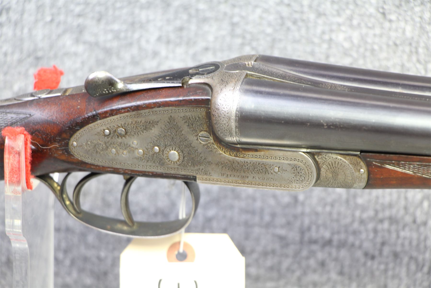 Gorgeous English sidelock upland double. Finely engraved. Doll head lug. Tiniest handling marks. No dings on the barrels. Slight freckling where held. No cracks nor gouges in the wood and only very shallow dings. Comes with William Evans hard case in very good condition. Cleaning rod and tips included.