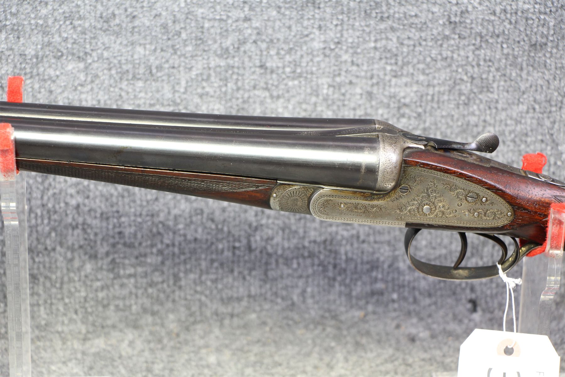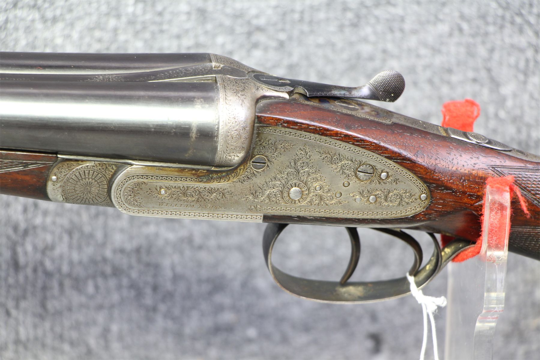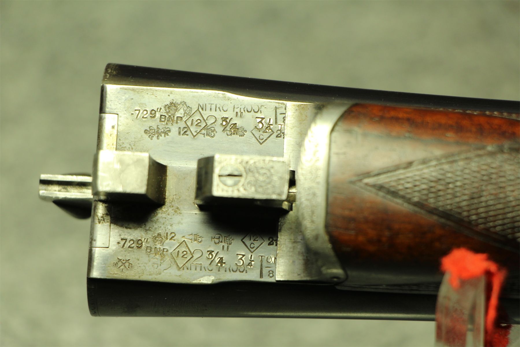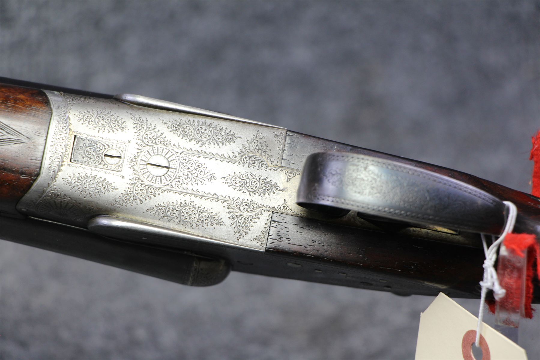 Gorgeous English sidelock upland double. Finely engraved. Doll head lug. Tiniest handling marks. No dings on the barrels. Slight freckling where held. No cracks nor gouges in the wood and only very shallow dings. Comes with William Evans hard case in very good condition. Cleaning rod and tips included.
