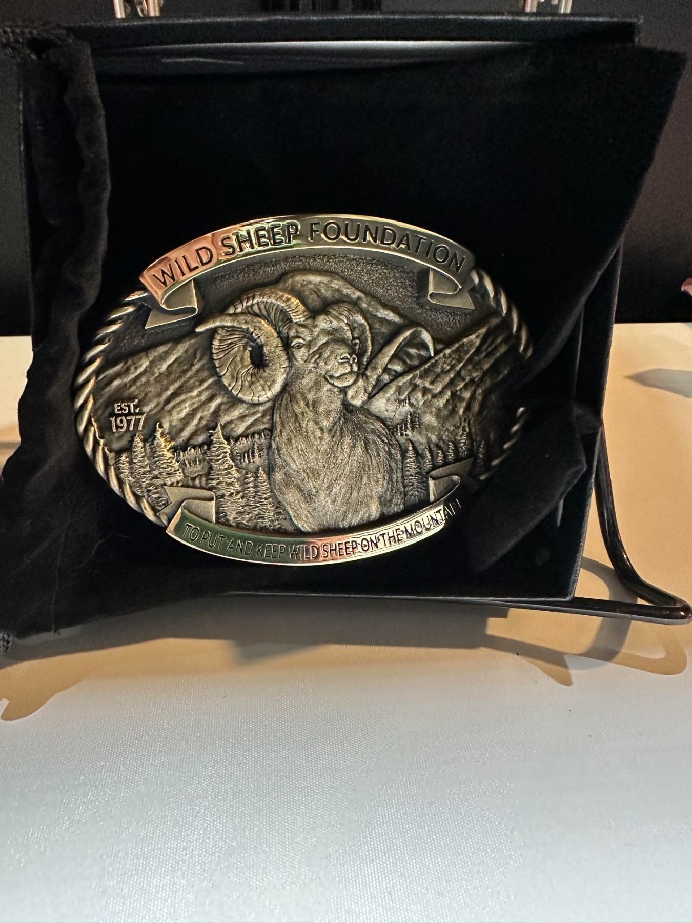 Description: (100% Fully Donated)NEW for the 2023 Sheep Show- Official Wild Sheep Foundation “Putting and Keeping” Buckles- Bronze