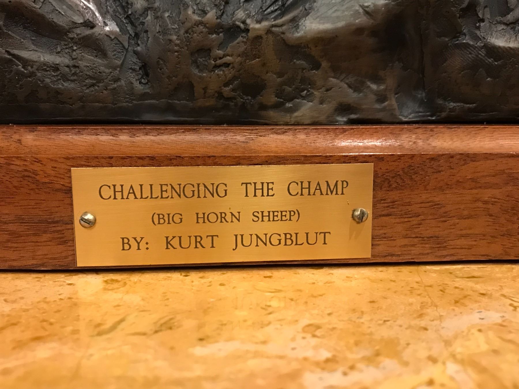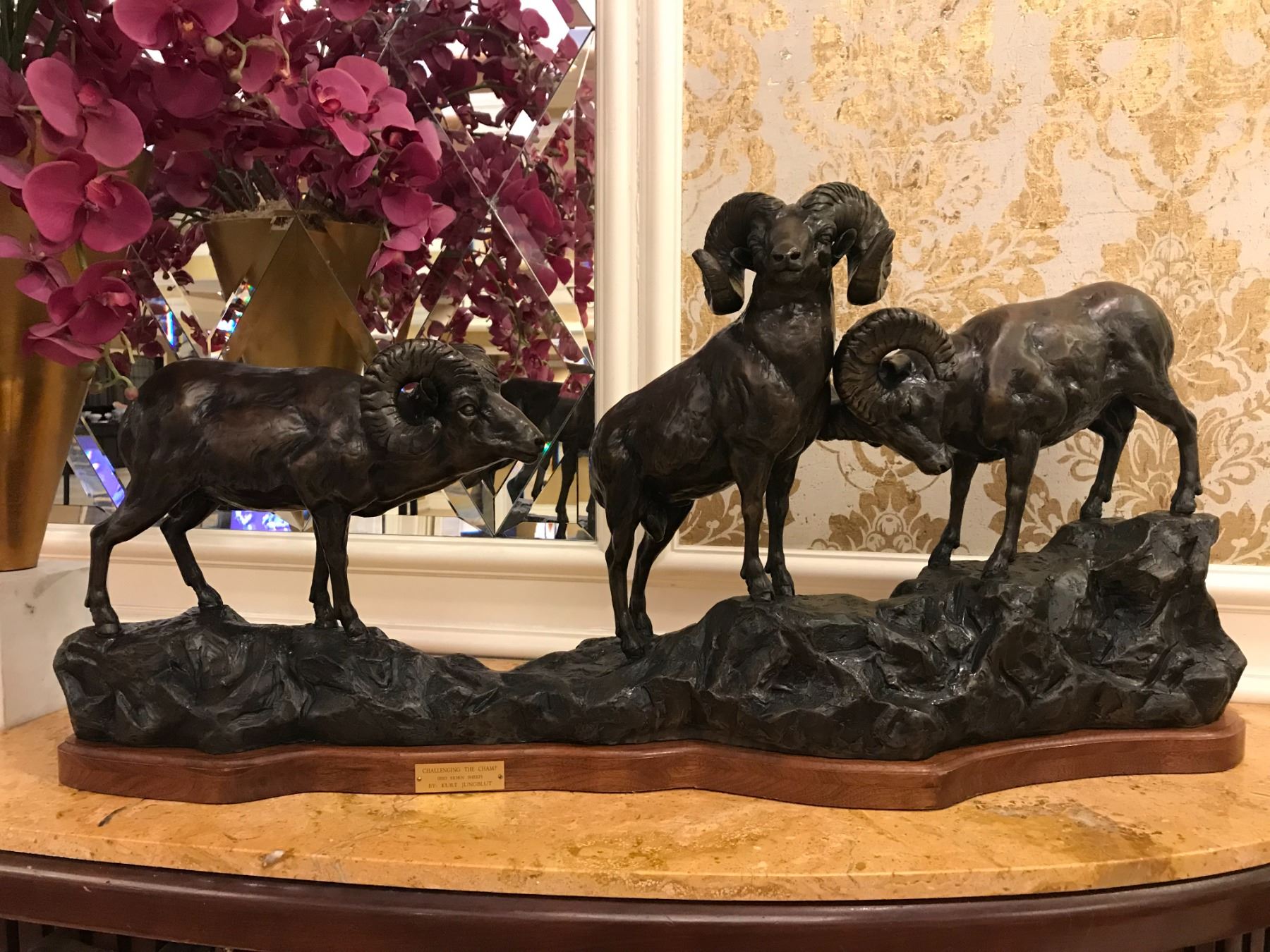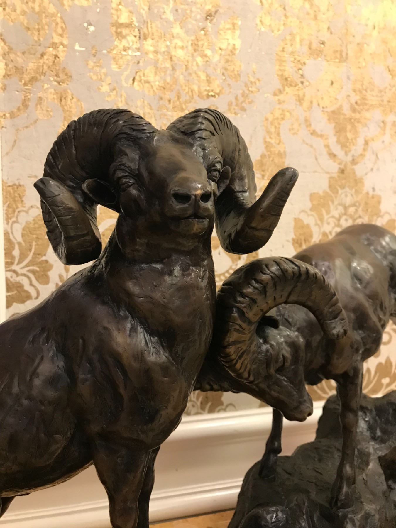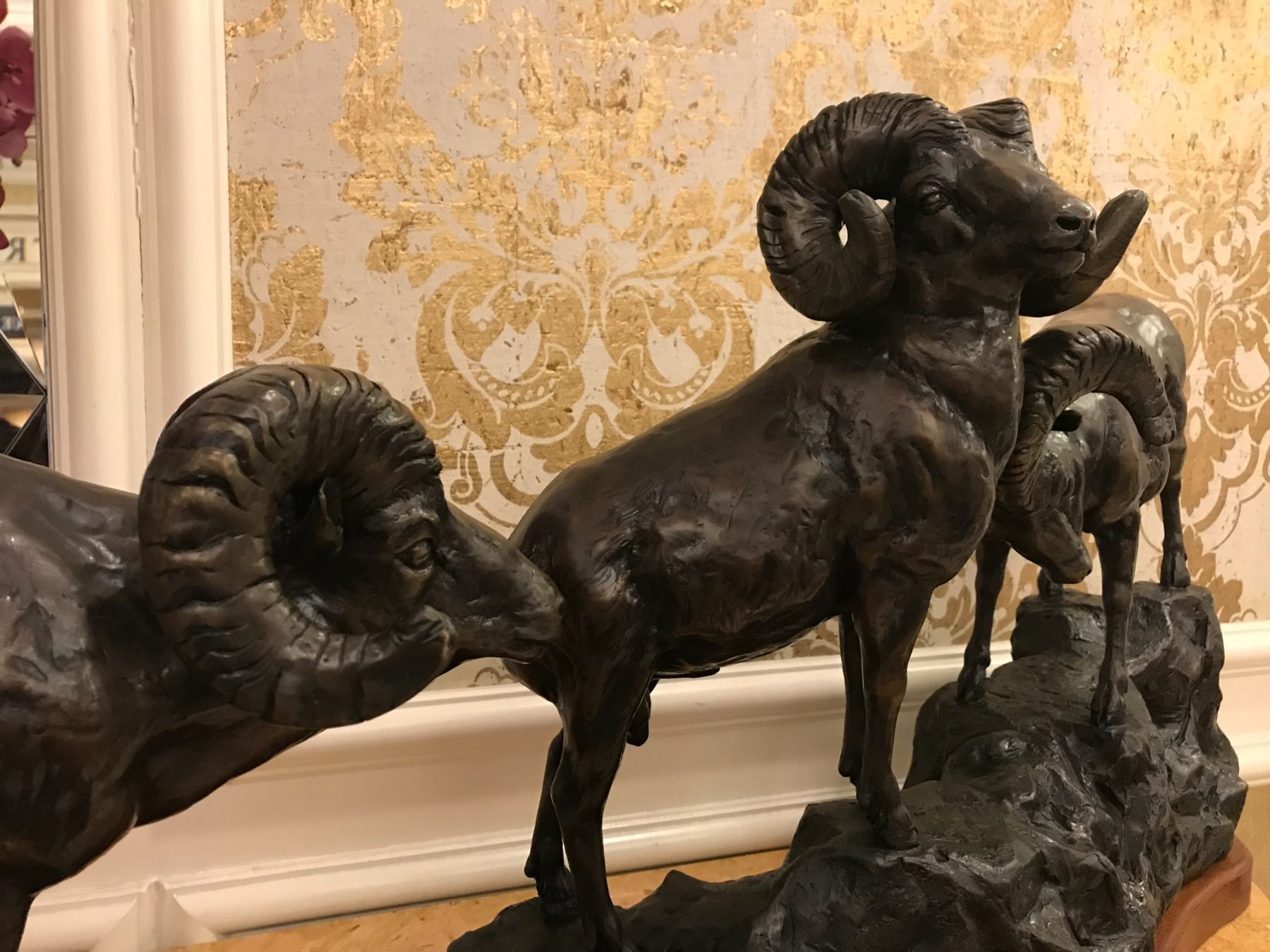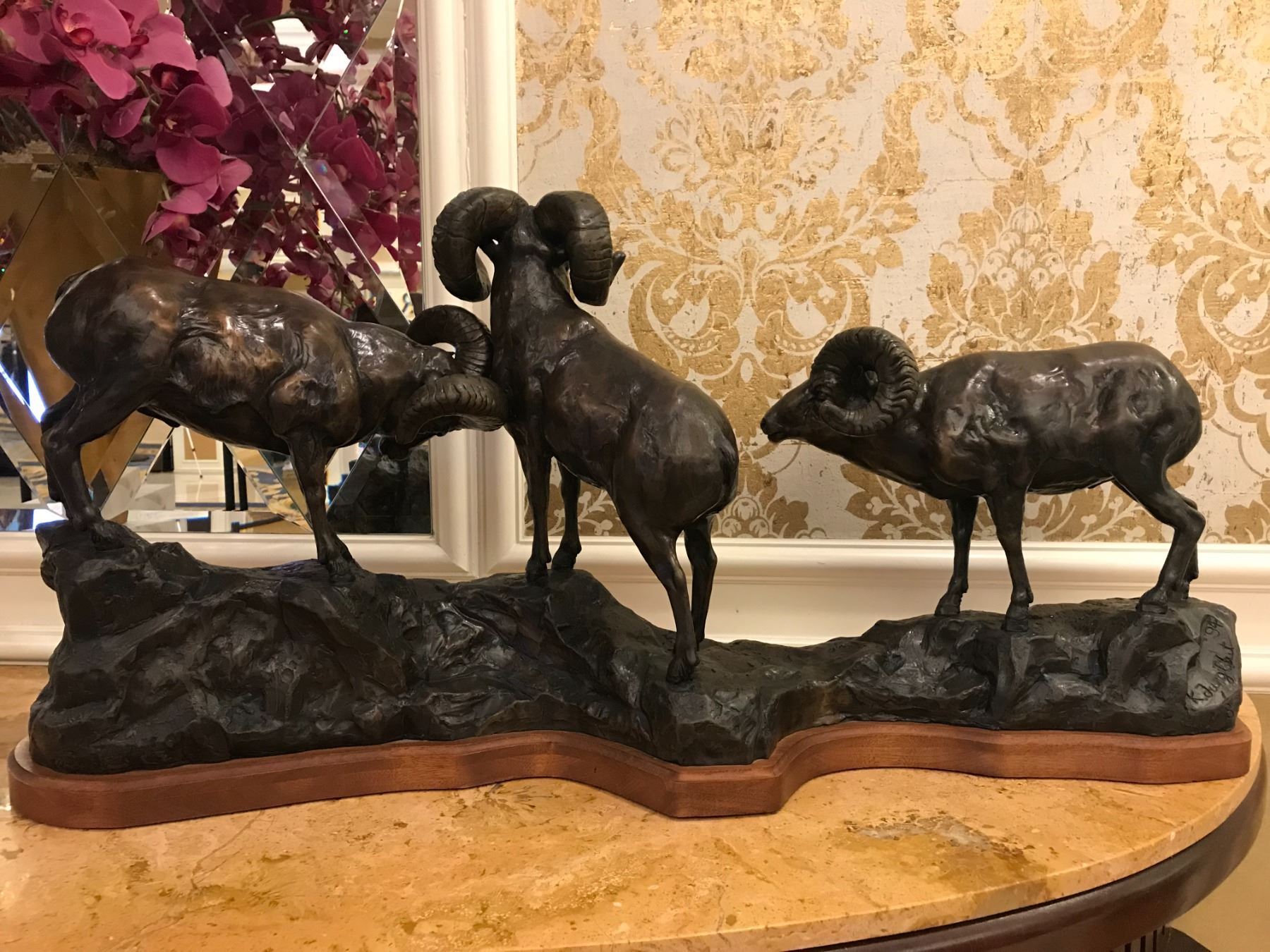 •This bronze depicts three bighorn sheep in a battle for supremacy.