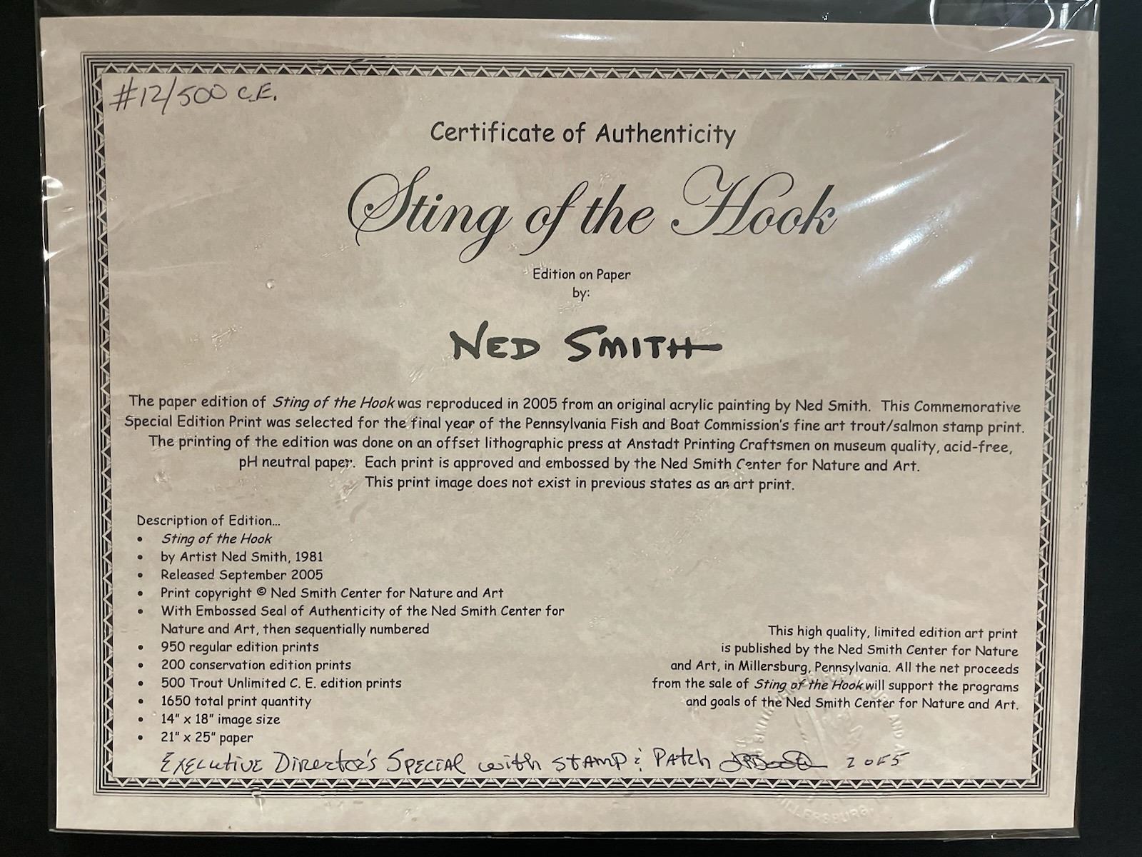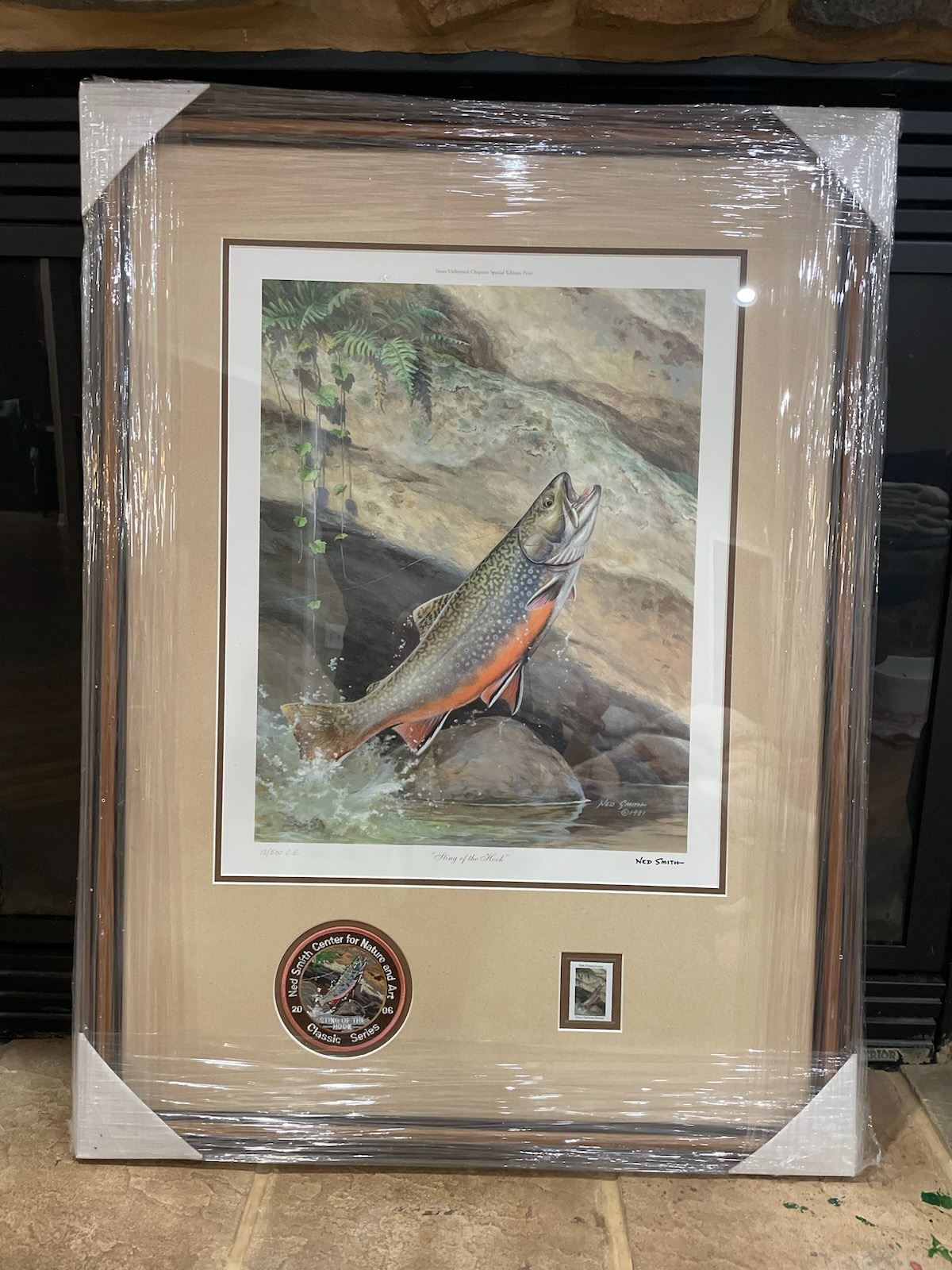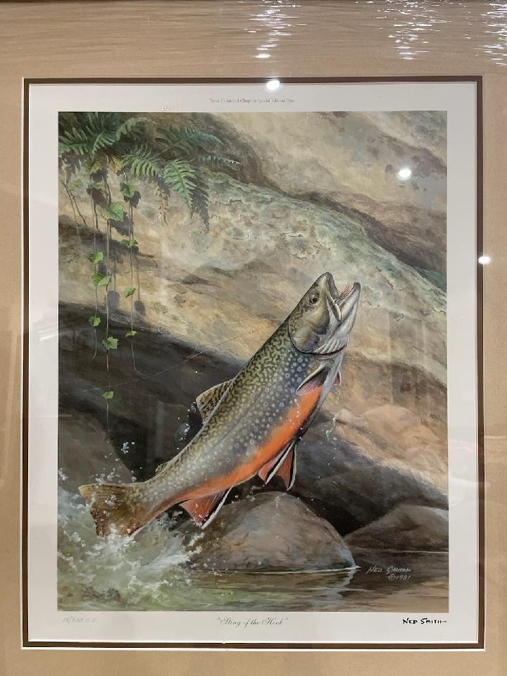 The paper edition of “Sting of the Hook” was reproduced in 2005 from an original acrylic painting by Ned Smith. This Commemorative Special Edition Print was selected for the final year of the Pennsylvania Fish and Boat Commission’s fine art trout/salmon stamp print. The printing of the addition was done on an offset lithograph press at Anstadt Printing Craftsman on museum quality acid free PH neutral paper. Each print is approved and embossed by the Ned Smith Center for Nature and Art. This print image does not exist in previous states as an art print image size is 14 inches by 18 inches and paper size is 21 inches by 25 inches. This is a 100% donation!