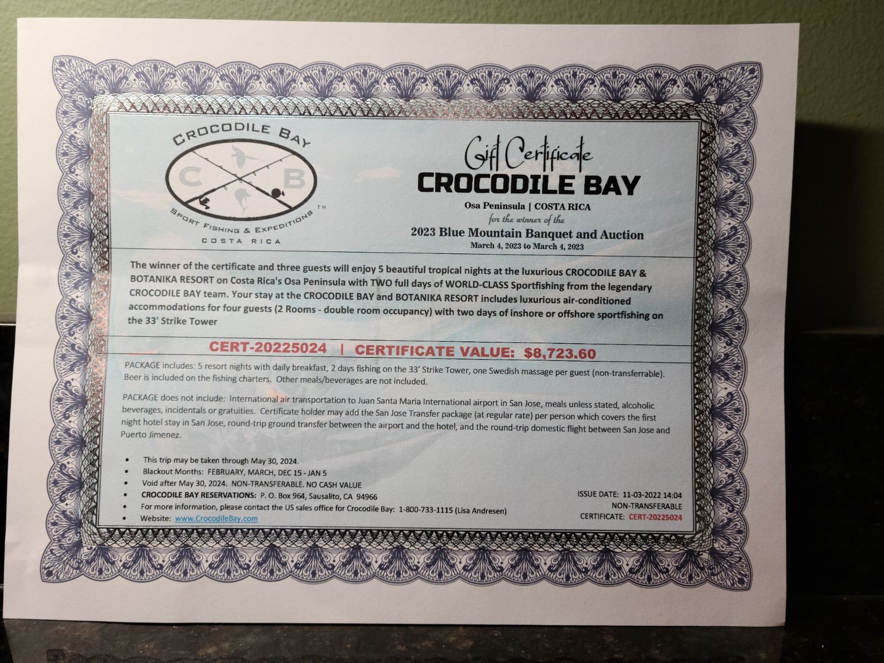 This trip may be taken through May 30th, 2024. Blackout months, February, March, December 15 through January 5th. Void after May 30th, 2024. NON-TRANSFERABLE, NO CASH VALUE.