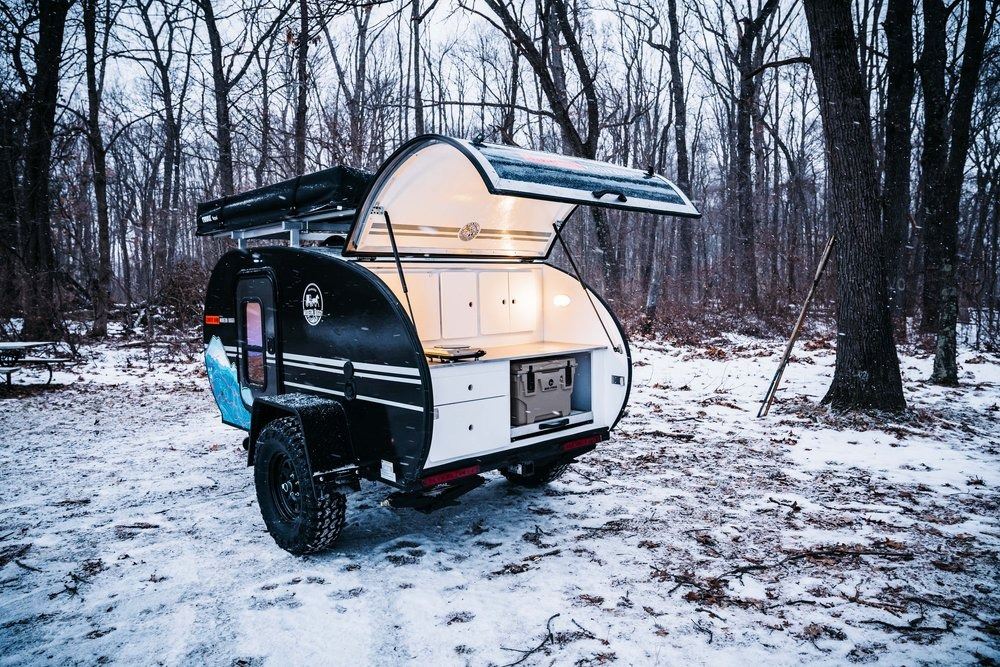take you off roading and exploring deep into the woods. This trailer is built on an industrial strength, quality custom steel frame, and is welded together with hand-crafted aluminum and fiberglass parts. Loaded with a 3,500-pound torsion axle, heavy duty diamond plated wheel wells, a steel front lip storage/battery box, accessories hitch, and a custom stainless-steel roof