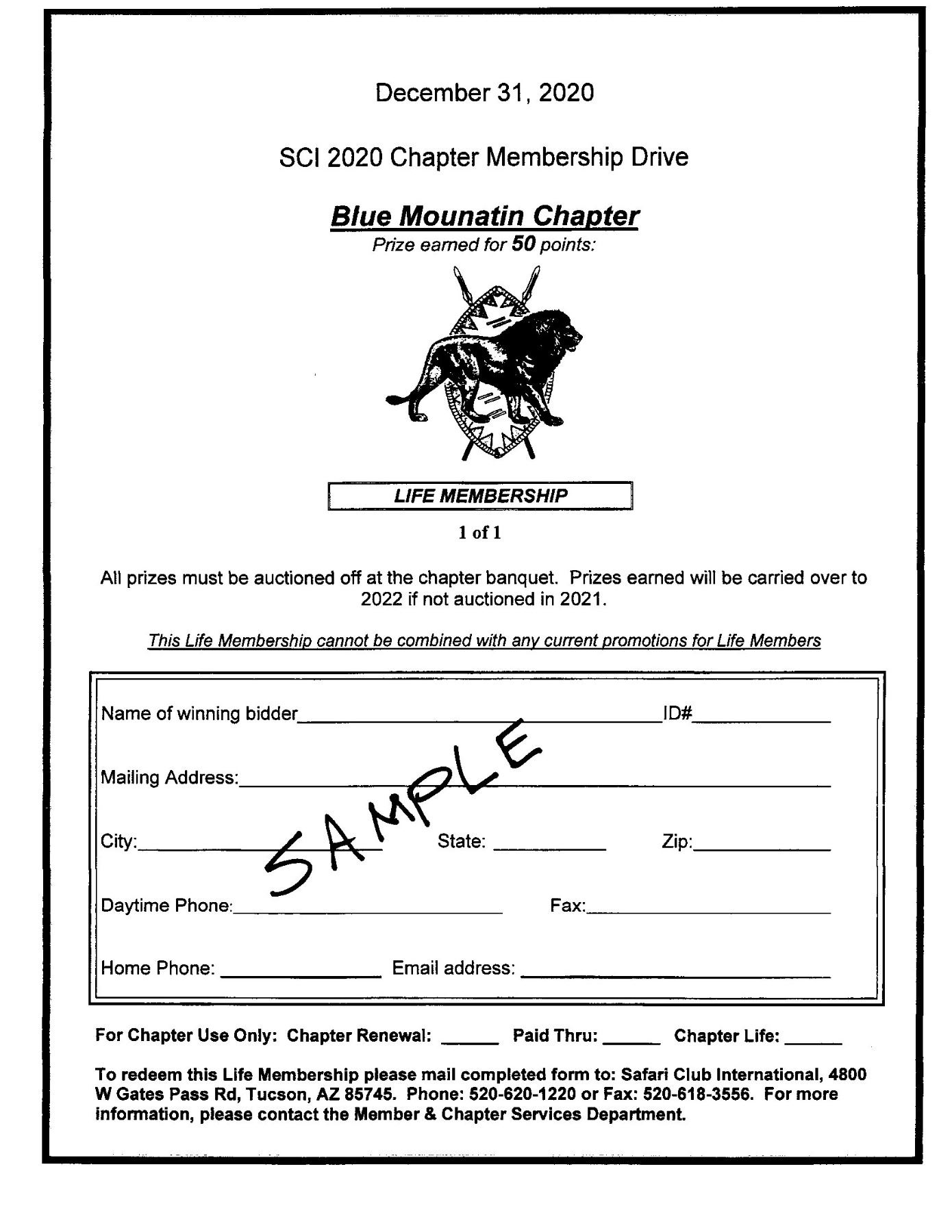 The winning bidder is entitled to A Lifetime Membership to SCI. Blue Mountain Chapter will fill out the certificate with the winning bidder’s information and forward it to SCI Member Services to be processed. Blue Mountain Chapter will also provide the winning bidder with a copy of the completed certificate.