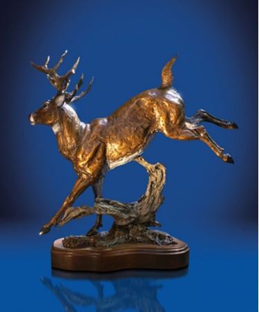Up for auction is an 18"Hx20"Wx9"D masterpiece bronze of a large antlered Whitetail buck entitled "High Tail" by renowned artist Lorenzo Ghiglieri. The sheer power, magnificence and magnitude of the works of this modern American Master transcend description through mere words. The visual impact of his artwork speaks volumes and moves the uninitiated fine art admirer, the novice fine art collector and the seasoned fine art aficionado, alike. DONATED BY: TREASURE INVESTMENTS, Angie Zook