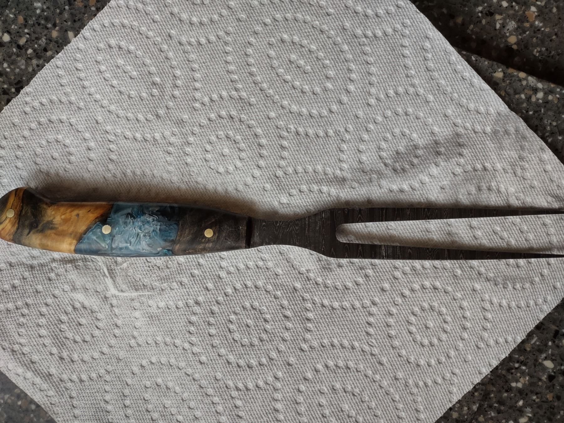 Up for auction is a Grill Carving Set of 3 Chef Knives and a Fork made of 416-layer Alabama Damascus Steel with Exotic Stabilized Wood and Resin Handles all held in a display box. DONATED BY: MIGHTY SHARP CUTS, Ron Sandberg