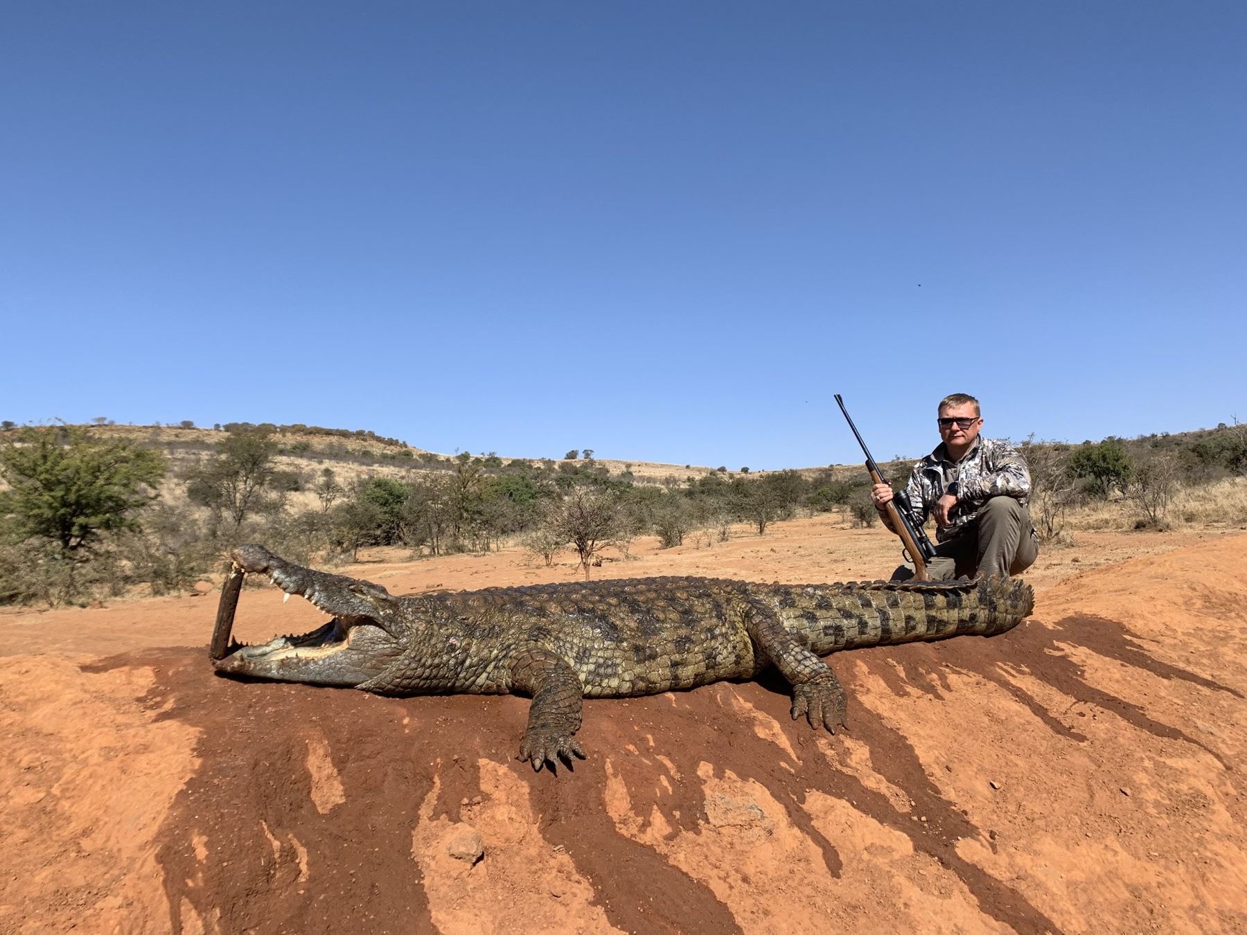 Frikkie Jacobs and Darren Wehner have donated a 3-day Trophy Crocodile hunt with weapon of choice from among rifle, handgun, bow and crossbow for 1 hunter in the Kalahari of South Africa to be taken in 2023 or 2024 and includes meet and greet assistance at Johannesburg airport; daily fees for 1 hunter guided 1x1 by a professional hunter and his staff for 3 days; all meals and accommodations with water and soft drinks; daily laundry service; and recovery and field prep of your trophies. A rifle can be provided by the outfitter. Also includes the trophy fee for a crocodile 2.8-3.32 meters long and $1000 credit toward your taxidermy for this hunt by St. Clair Flats Taxidermy of Algonac, MI. Not included are fees for additional days, dipping, packing, and shipping of your trophies; airfares; and gratuities. This donation also excludes Johannesburg airport pickup and return at $400 per vehicle/3 persons and airport customs costs. Additional hunters welcome at $350/day each and non-hunters are welcome at $300/day each. Any of 30+ plains game animals may also be taken per the current price list. Johannesburg, South Africa is the arrival and departure location. For further details and to book your hunt contact Darren Wehner directly. DONATED BY: SHINGALANA SAFARI and ST. CLAIR FLATS TAXIDERMY, Darren Wehner