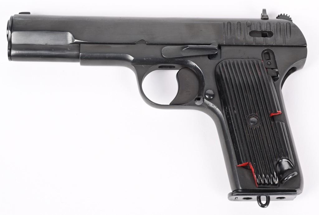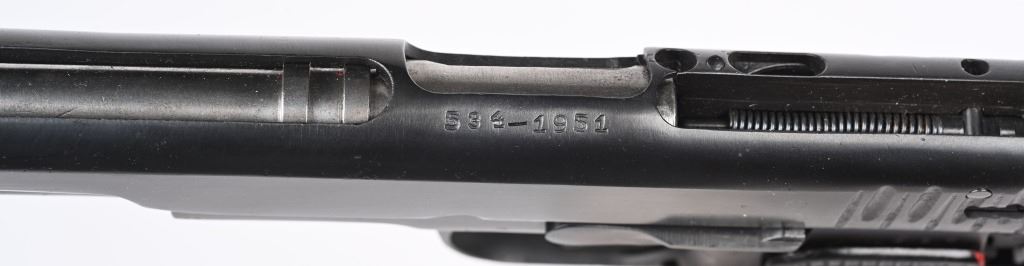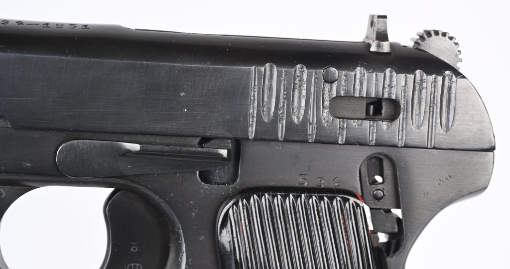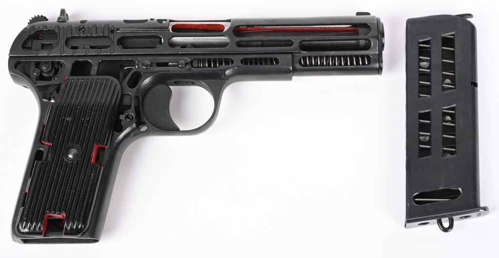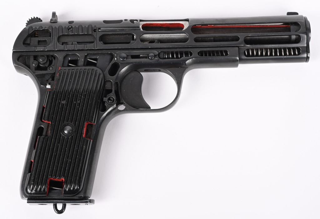 SERIAL NUMBER 534 BARREL 4-1/2" CALIBER 7.62X25 MANUFACTURED 1951. Produced at the arsenal as an instructional aid with machined cut-outs to expose moving parts and operations. marked on slide horizontally "534-1951" this is opposed to the standard pistol markings that vertically across the top of the slide. matching numbers on slide and frame. No test fire proofs or import markings. A total of 52 individual cut-out have been performed and highlighted in red paint to reveal the operation and function of the pistol and magazine. CONDITION, Very fine. Pistol retains all of its blue finish. A really interesting and uncommon pistol. This item is still considered a firearm by regulations. C&R