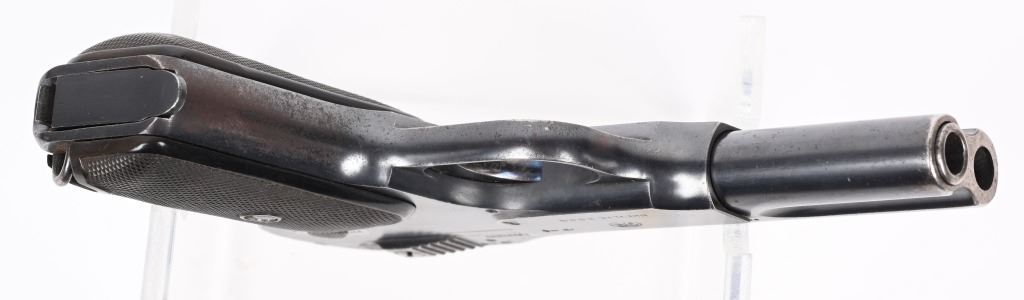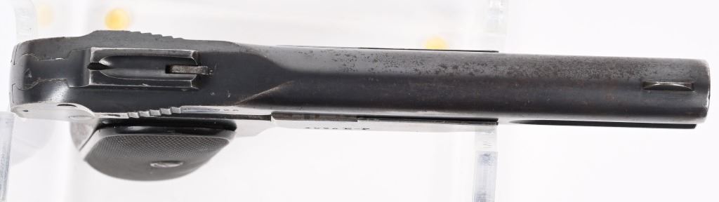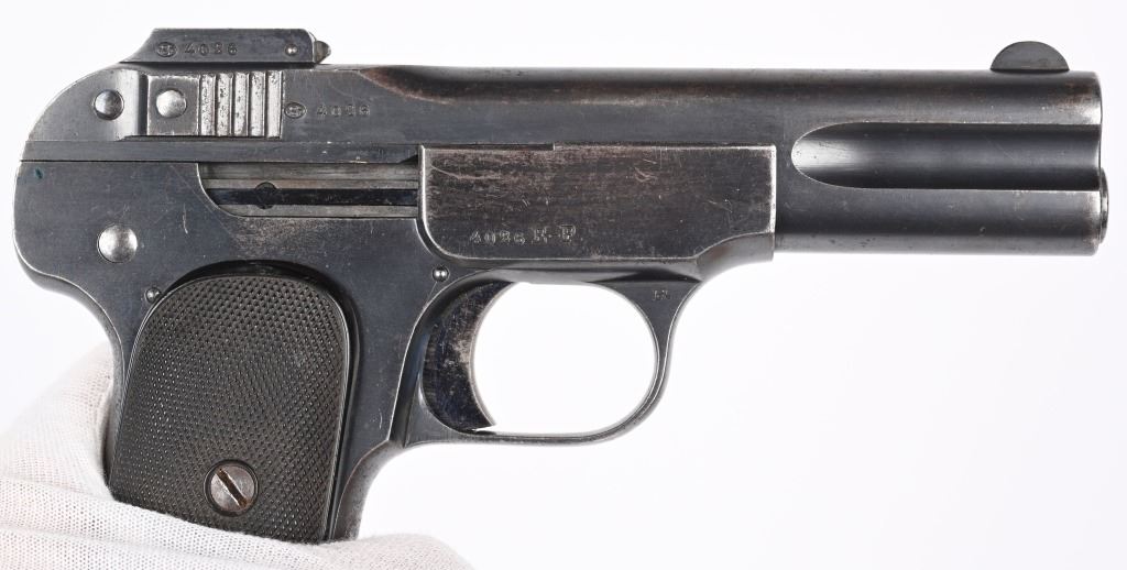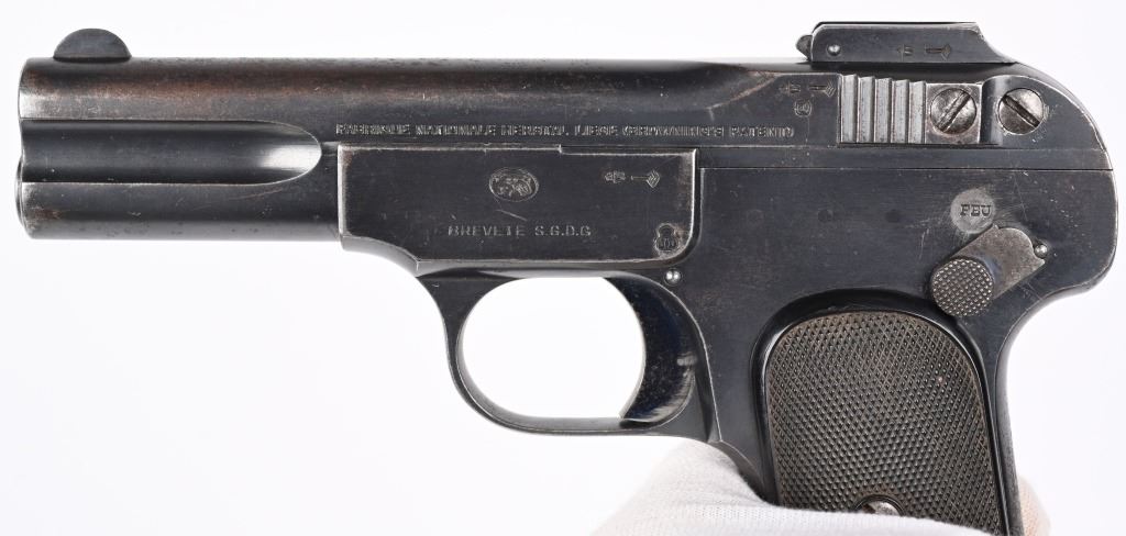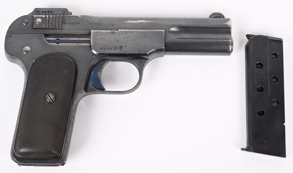SERIAL NUMBER 4026 BARREL 4" CALIBER 7.65 / .32 ACP MANUFACTURED 1900-1910. Rust blue finished with military pattern checkered bakalite grips. Standard FN single line legend on slide with Belgian military acceptance marking (Crown over JD) on left side of frame. Fire blue finished safety , trigger and extractor. Matching numbers. CONDITION, Very good with over 95% rust blue finish remaining with losses at edges and grips straps. Fire blue finish is strong on trigger and extractor but only remains in protected areas of safety. Bore is good with light oxidation in grooves. Action operates properly. Grips are very good. A very scarce surviving specimen. C&R