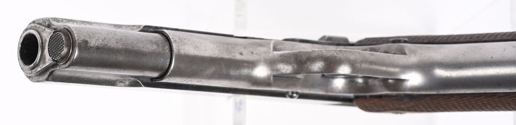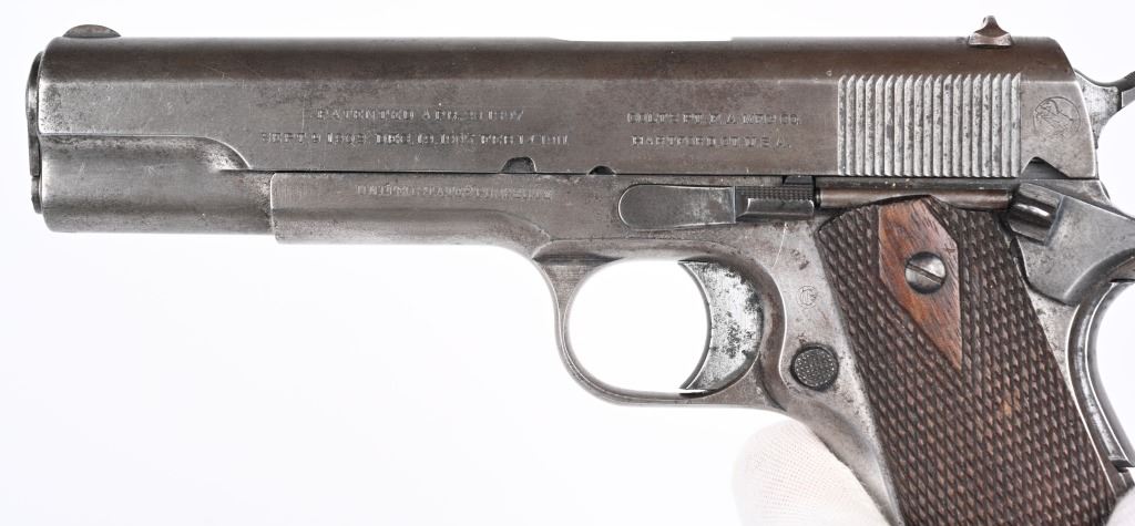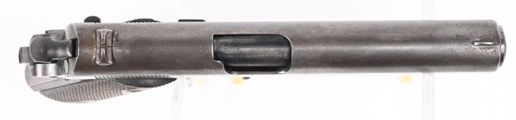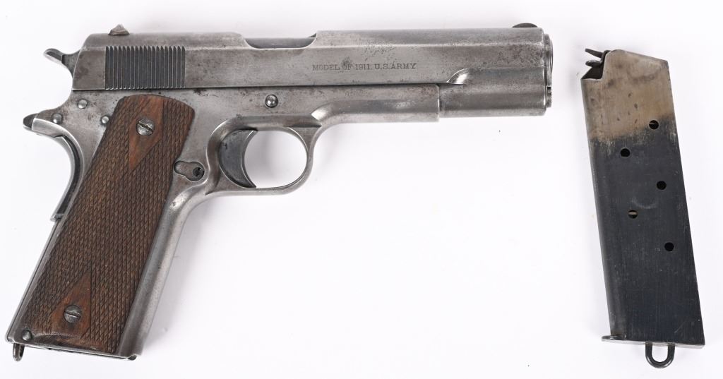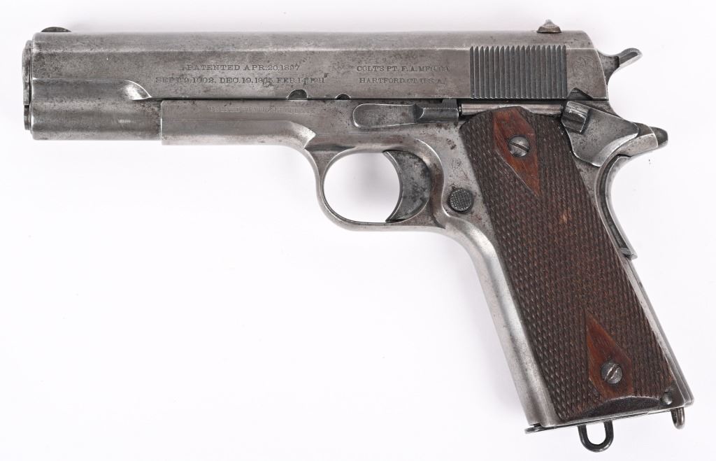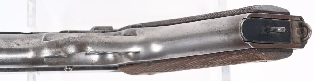 SERIAL NUMBER 6022 BARREL 5" CALIBER .45 ACP MANUFACTURED 1912. Very early production inspected "WGP" (Walter Penfield) with early features including first pattern magazine retaining screw with dimpled with slot, recoil spring cap with out detent, early round rear sight and tapered front sights. Lanyard loop equipped "Key-Hole" 2 tone magazine. Short wide checkered hammer serial number on right side forward of trigger guard. Barrel proofed properly P over H , checkered large diamond walnut grips. Manufactured between May & Oct, of 1912. CONDITION, Good as found with little finish remaining on exterior. All markings are crisp and legible. Bore is very good with slight oxidation in corners of grooves. Action operates properly. Grips are good with slight wear. A scarce early pistol rarely encountered in its original unaltered configuration. C&R